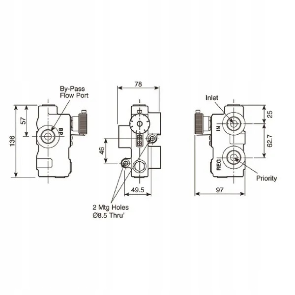 ✅ Поток масла, подаваемый в порт P, делится на «приоритетный» регулируемый и не зависящий от давления поток масла в порт REG и «байпасный» поток масла в порт BP, который можно подключить к резервуару и использовать во второй циркуляции.