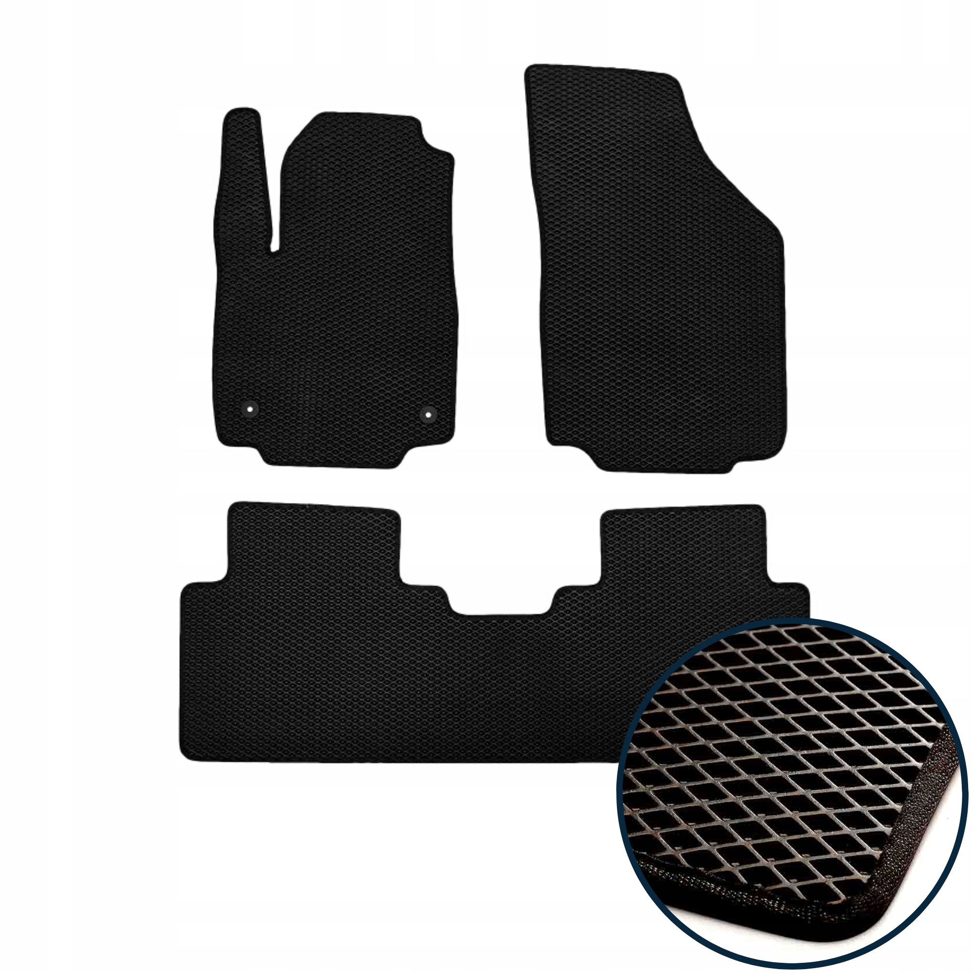 - С ковриками из современного материала EVA вы легко сможете содержать свой автомобиль в чистоте. Уникальная форма ячеек коврика глубиной 6 мл задерживает любую грязь и воду, не позволяя им выливаться за пределы ковра.