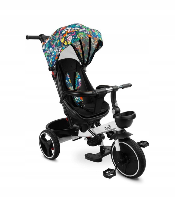 Трехколесный велосипед Dash — отличная альтернатива коляске. Его можно использовать как велосипед, на котором ребенок может кататься самостоятельно, так и как коляску с навесом, в которой ребенка можно перевозить как вперед, так и назад. В передней и задней части велосипеда имеются корзины для перевозки мелких вещей. Велосипед оснащен двумя подножками: выступающими из рамы велосипеда и прикрепленными к сиденью. Каждая подножка регулируется для комфорта ребенка. Задние колеса велосипеда оснащены тормозами, что позволяет безопасно покинуть велосипед, не беспокоясь, что он уедет сам.