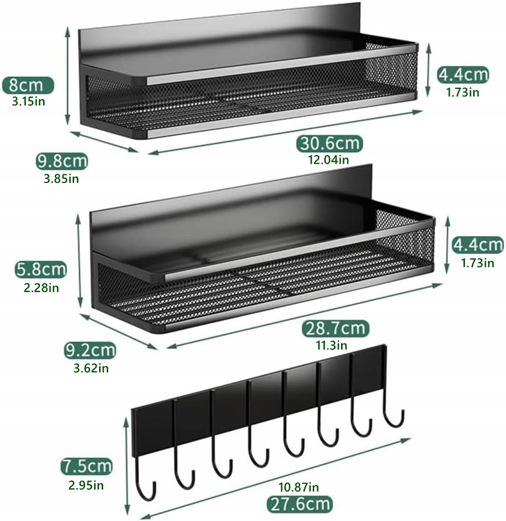 Этот набор магнитных полок включает в себя 2 полки и вешалку с 8 крючками, что делает его самой универсальной полкой для специй на рынке. Практичную вешалку с 8 крючками можно использовать для подвешивания различных предметов для стирки или кухонной утвари, таких как чашки, ножницы, фартуки, полотенца и т. д.