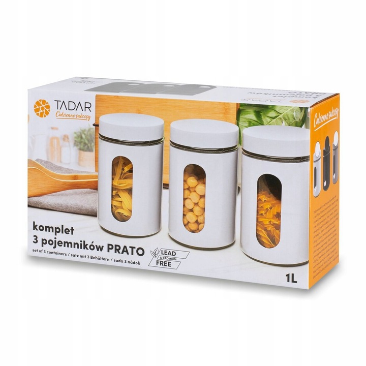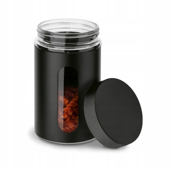 - Идеальный набор из 3 контейнеров для организации и хранения сухих ингредиентов (например, макарон, чайных хлопьев). Вам не придется открывать их, чтобы увидеть, что находится внутри, поскольку они сделаны из стекла и помещены в прочный стальной корпус с порошковым покрытием. Они хорошо защищают содержимое от загрязнения и атмосферных воздействий. Они отлично смотрятся на кухонной полке. Комплект доступен в черном цвете