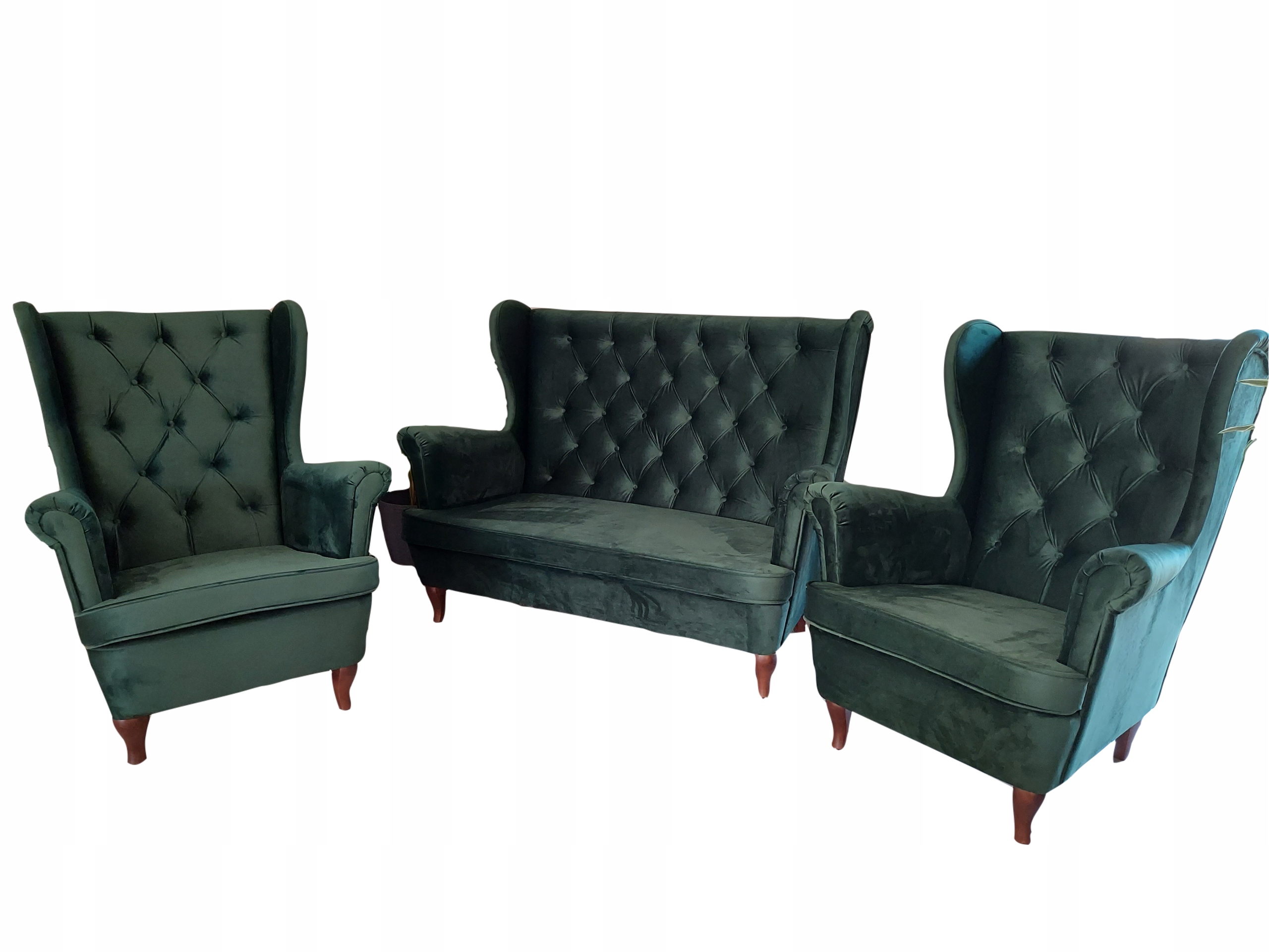 КРАСИВЫЙ БОЛЬШОЙ КОМПЛЕКТ НАДЕЖНЫЙ ТРЕХМЕСТНЫЙ ДИВАН НА ДЕРЕВЯННЫХ НОЖКАХ + 2 КРЕСЛА В ВЫБРАННОМ ЦВЕТЕ С ДЕРЕВЯННЫМИ НОЖКАМИ, СПИНКИ С ДЕРЕВЯННЫМ УЗОРОМ DEEP PICKS DIAMOND BUTTONS