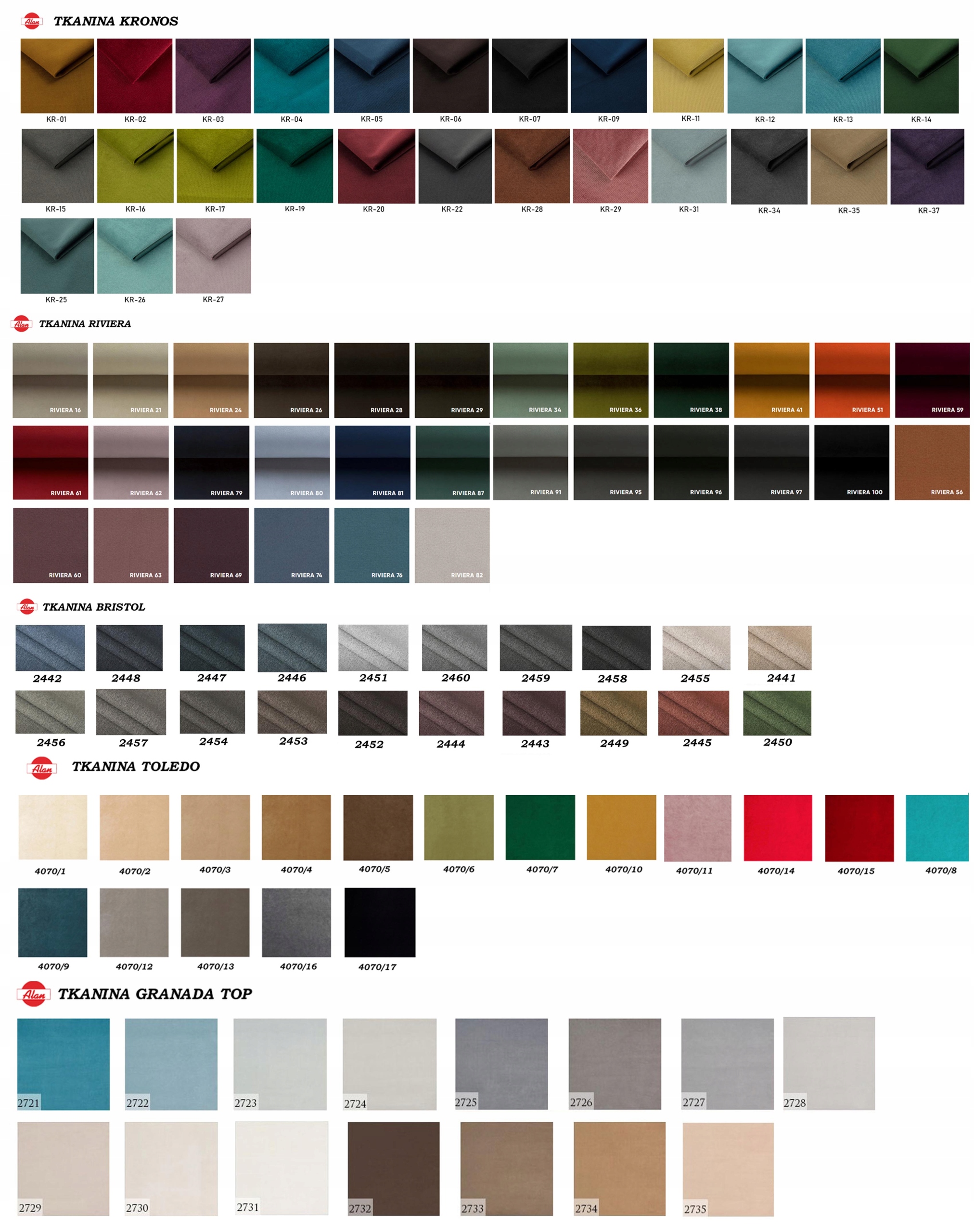 ПРЕМИУМ ТКАНИ (FUEGO, GRANADA, KRONOS, BRISTOL, RIVIERA, MONOLITH, СПАРТАКУС, ТОЛЕДО) ДОСТУПНО ЗА ДОПОЛНИТЕЛЬНУЮ ПЛАТУ К МАТЕРИАЛУ - 1680 злотых
