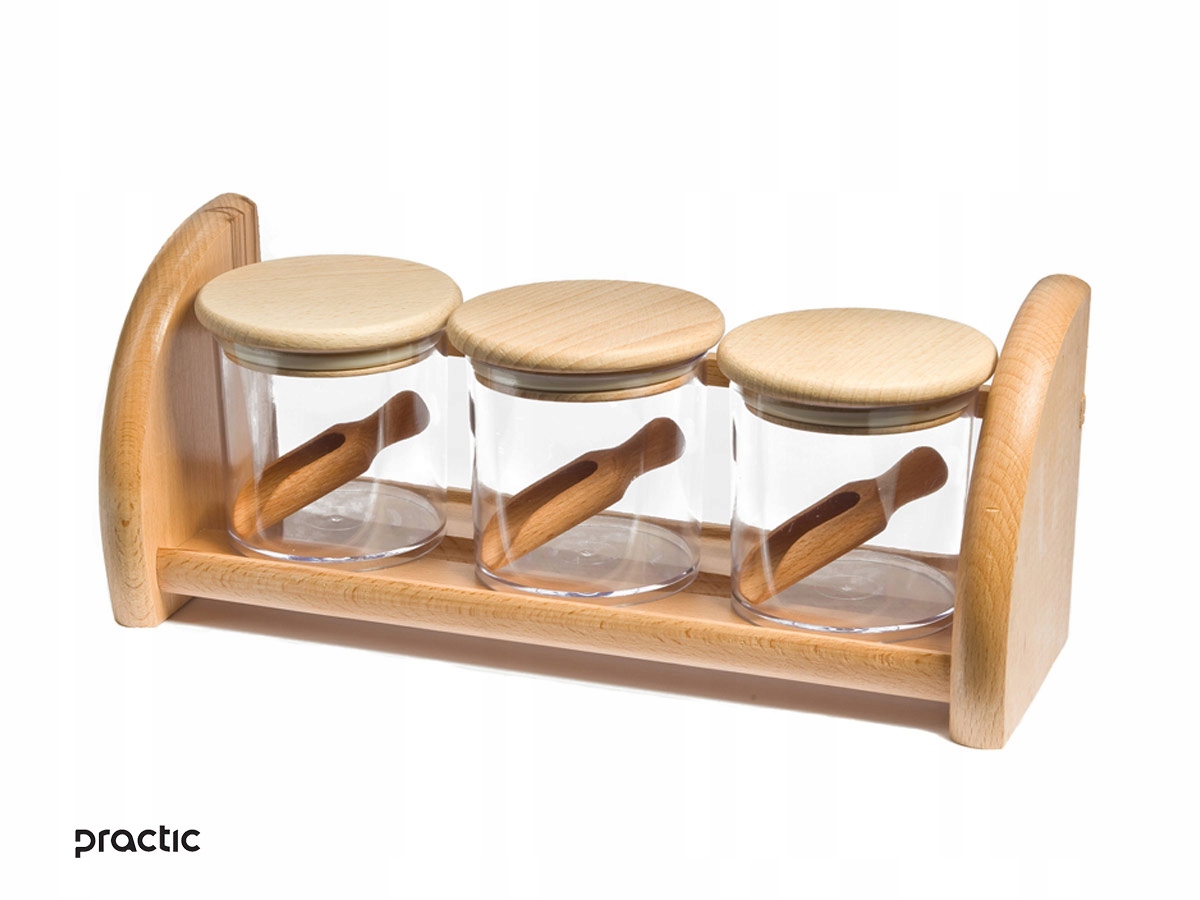 3 кухонных контейнера с ложками и практичная деревянная полка