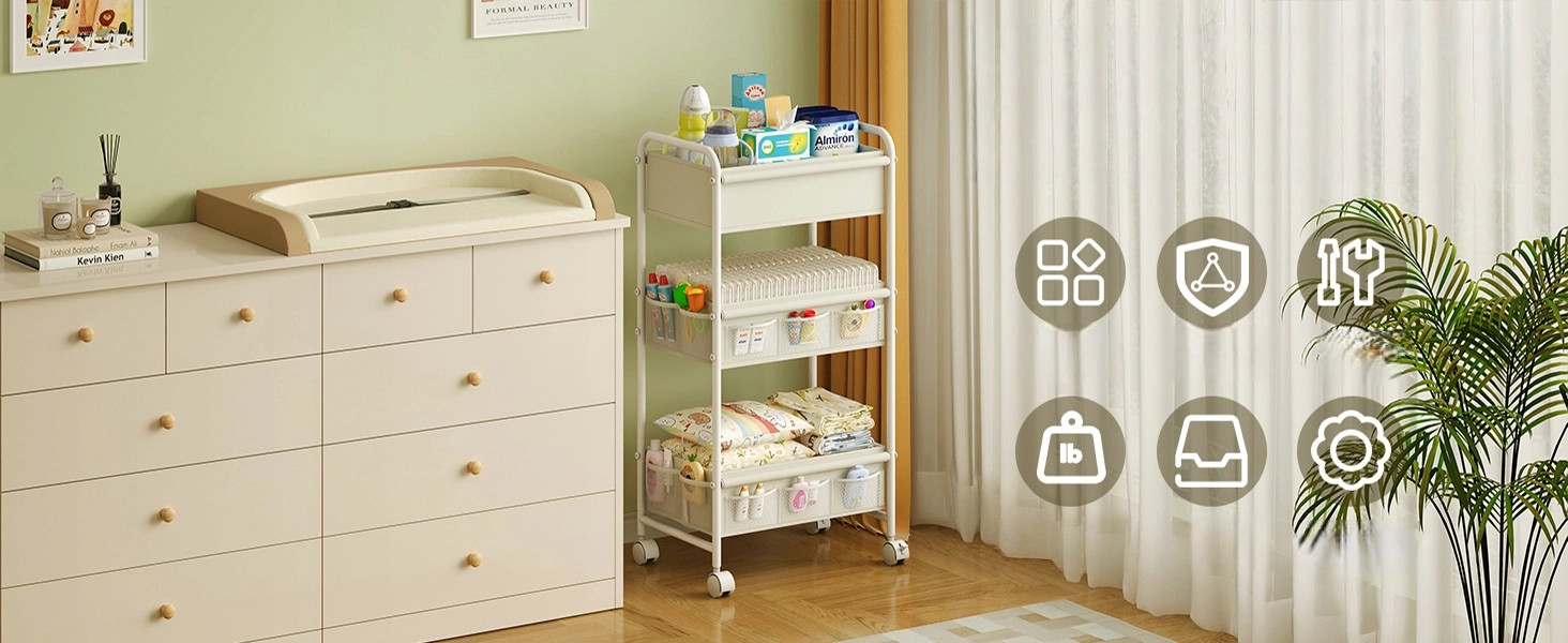 <р>1. Каркас коляски с подгузниками изготовлен из прочных и долговечных проволочных материалов, что позволяет ей выдерживать вес и нагрузки при ежедневном использовании. <р>2. Это позволяет родителям регулировать положение верхней перегородки коляски для размещения предметов разного размера или конкретных сценариев путешествия. Такая гибкость еще больше повышает удобство и практичность хранения.3.Нескользящие колеса обеспечивают устойчивое сцепление с различными поверхностями и предотвращают перемещение коляски.