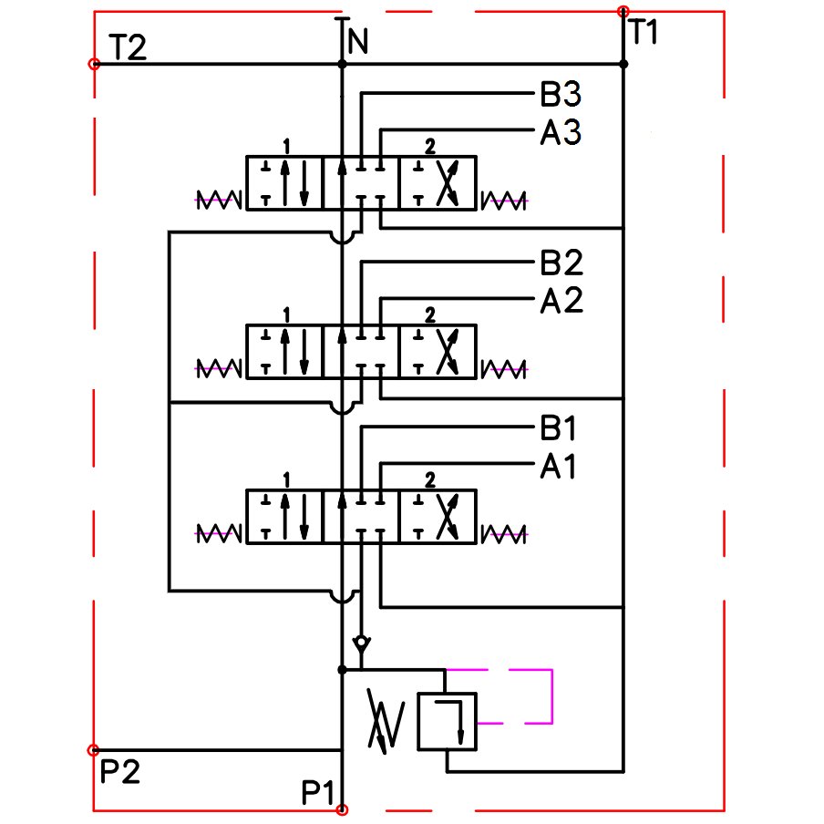 Рекомендуемый расход масла в системе: 0 - 40 л/мин. Пример управления: три привода двойного действия.