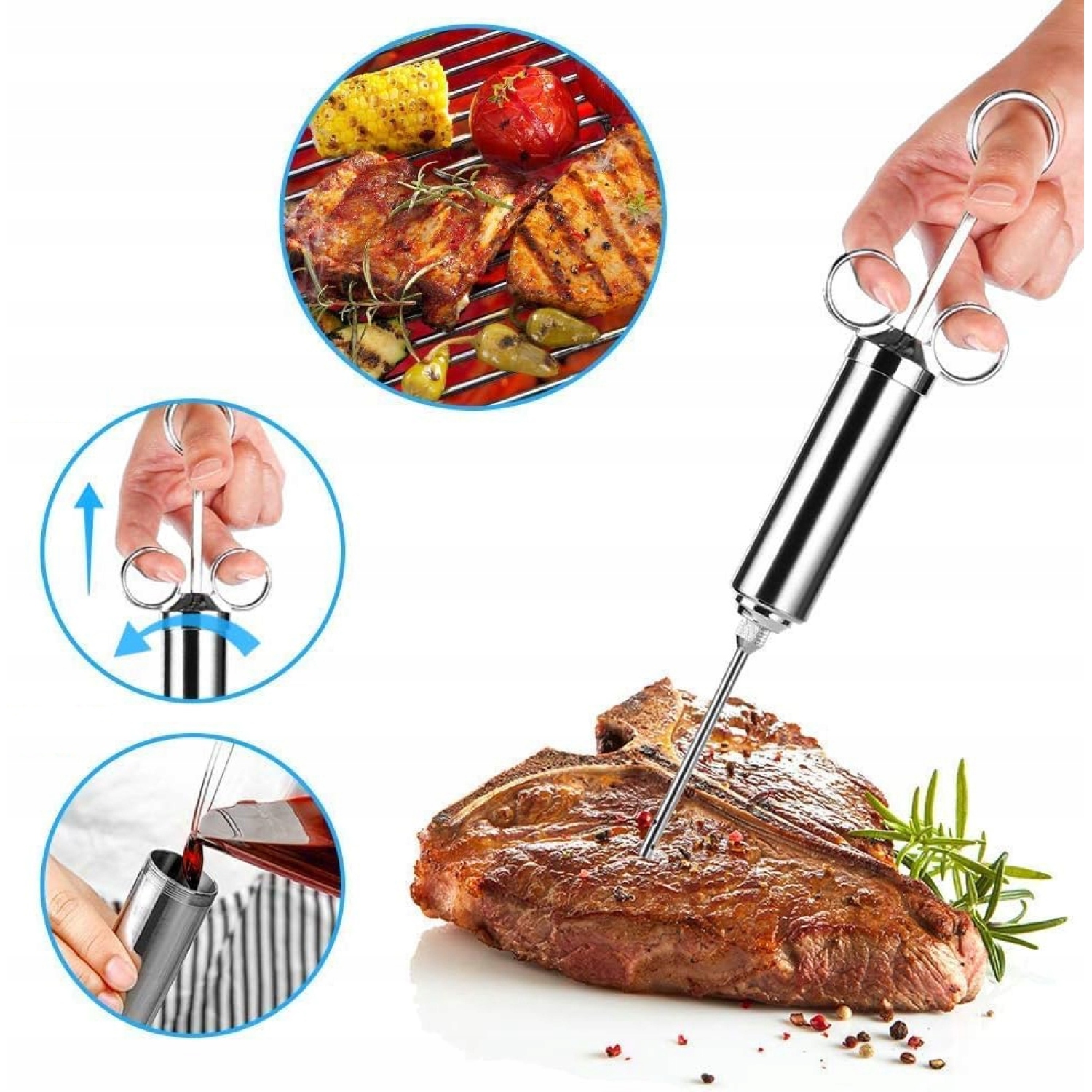 стриковая стриковая сталь с емкостью 60 мл: высокая пропускная способность, обеспечивающая полную маринование одновременно; Вы также можете использовать мариновый шприц для впрыскивания жидкого масла или ароматизированных масел или мелко нарезанных трав непосредственно в мясо. Три иглы для маринадов любой последовательности