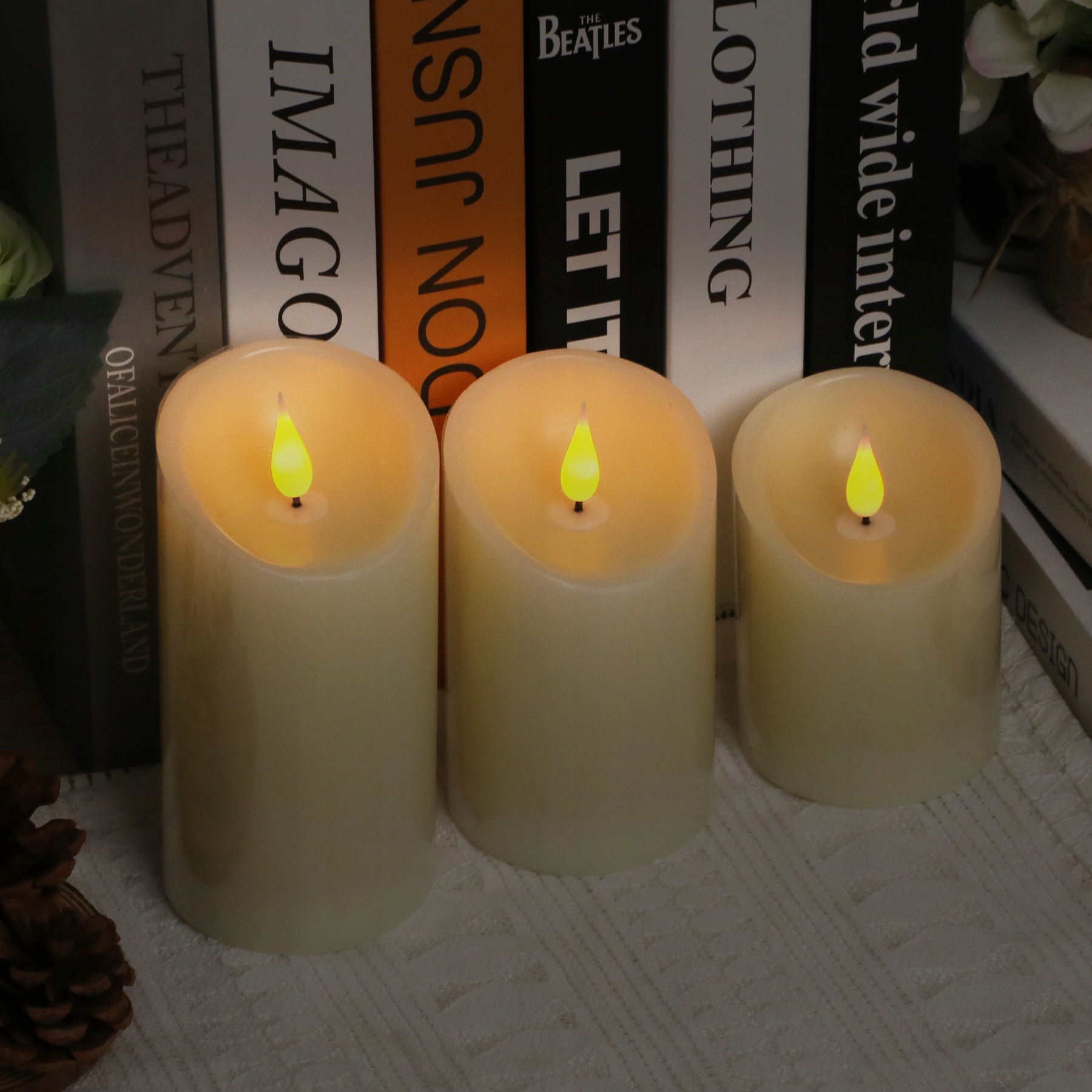 3D-фитиль и теплый свет делают эту беспламенную свечу-столб более подходящей для различных сценических украшений. Свет может отражаться в парафине, который не только более яркий, но и во многом имитирует настоящее пламя свечи.