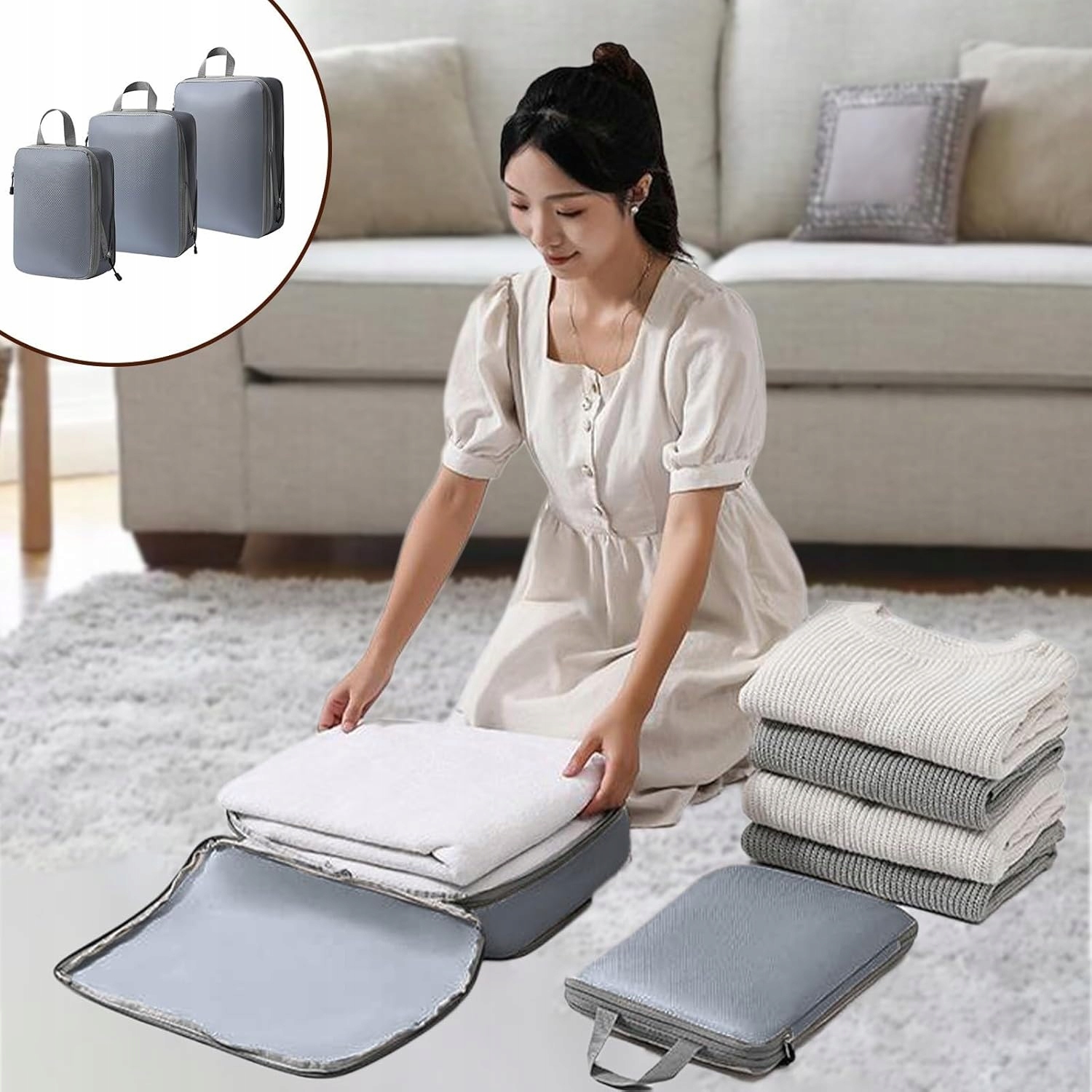 3 ШТ. КОМПРЕСІЙНИЙ ОРГАНІЗАТОР ДЛЯ ПАКУВАННЯ ДОРОЖНІХ ВАЛІЗ СУМОК НАБІР СІРИЙ
