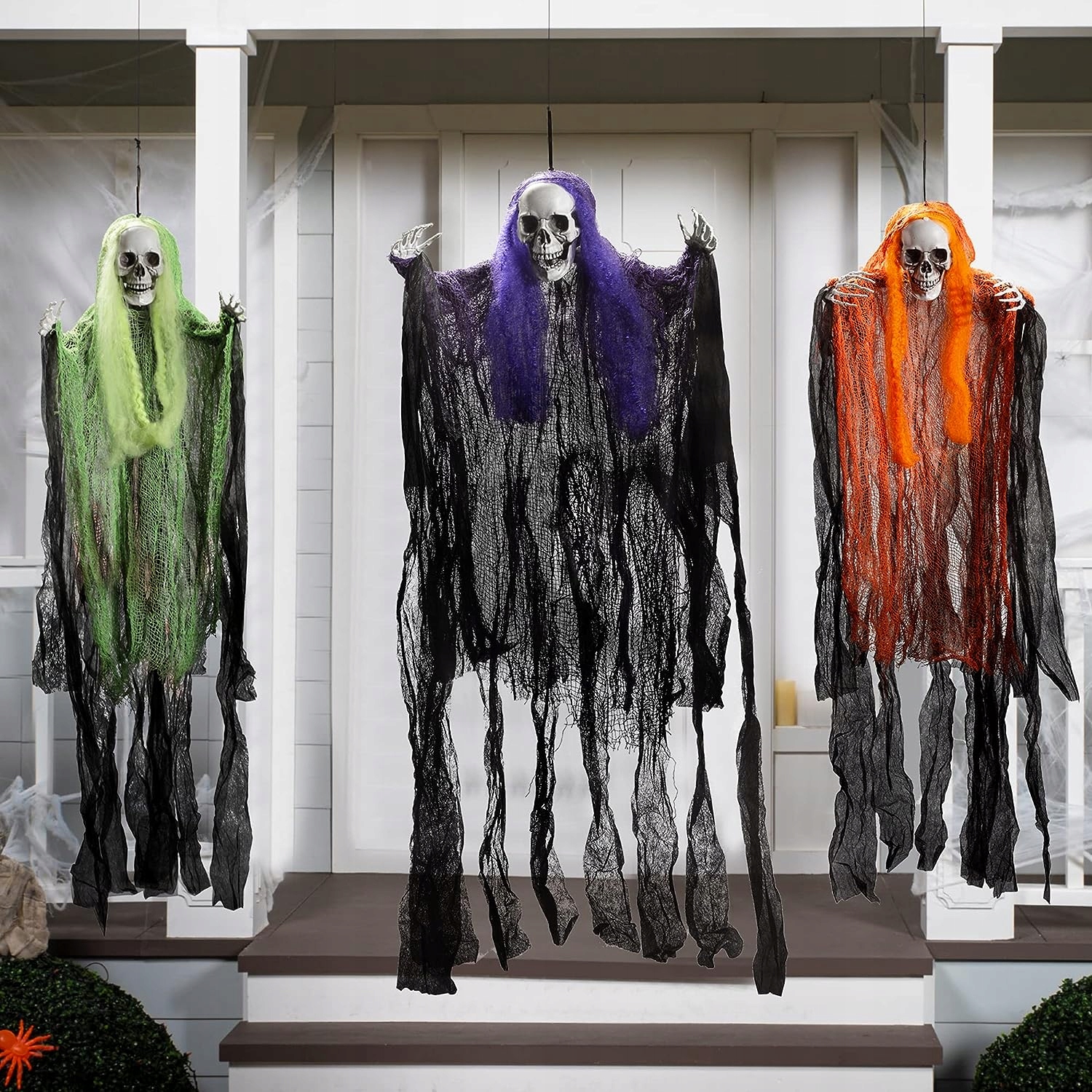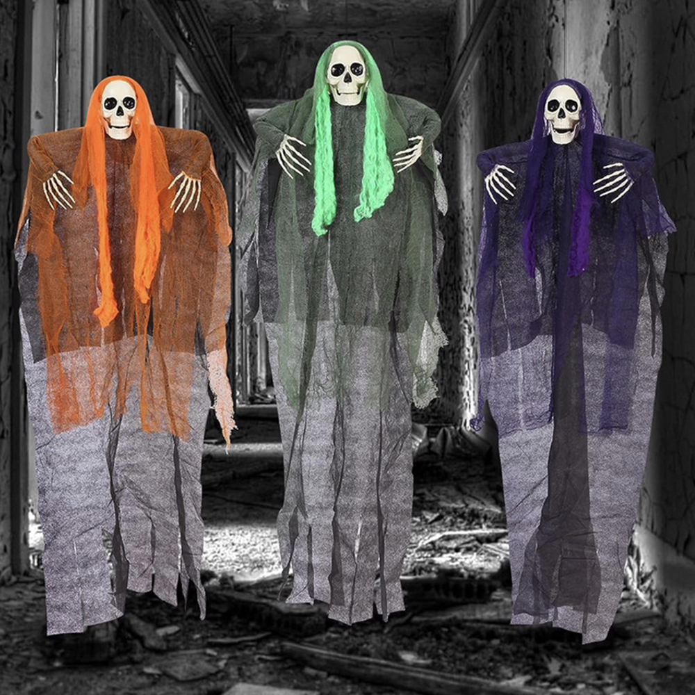 👻 Набор по отличной цене: Набор из трех страшных скелетов-жнецов с разными цветами одежды, волосами и размерами поможет вам создать жуткую и пугающую атмосферу на любой вечеринке в честь Хэллоуина.