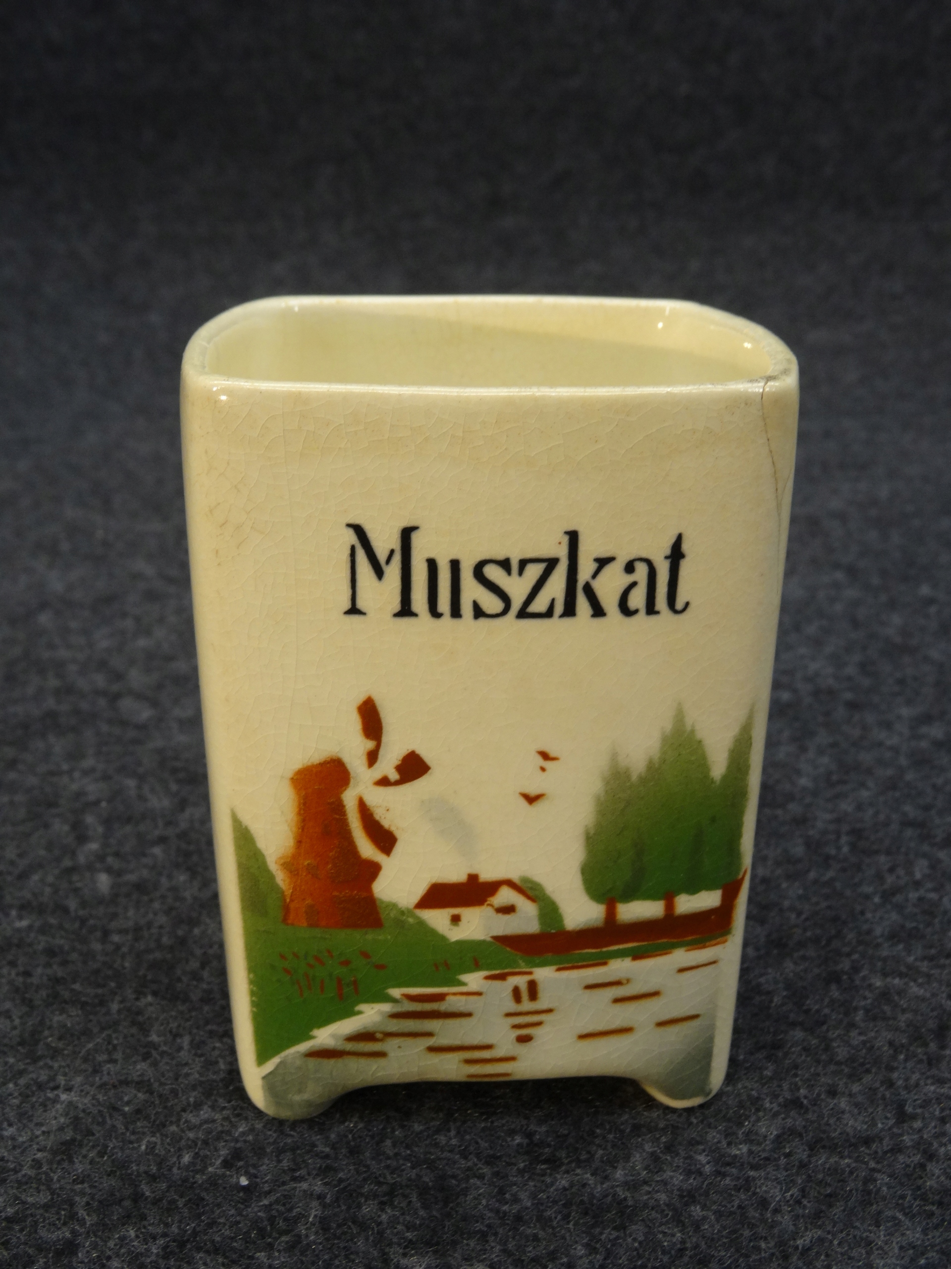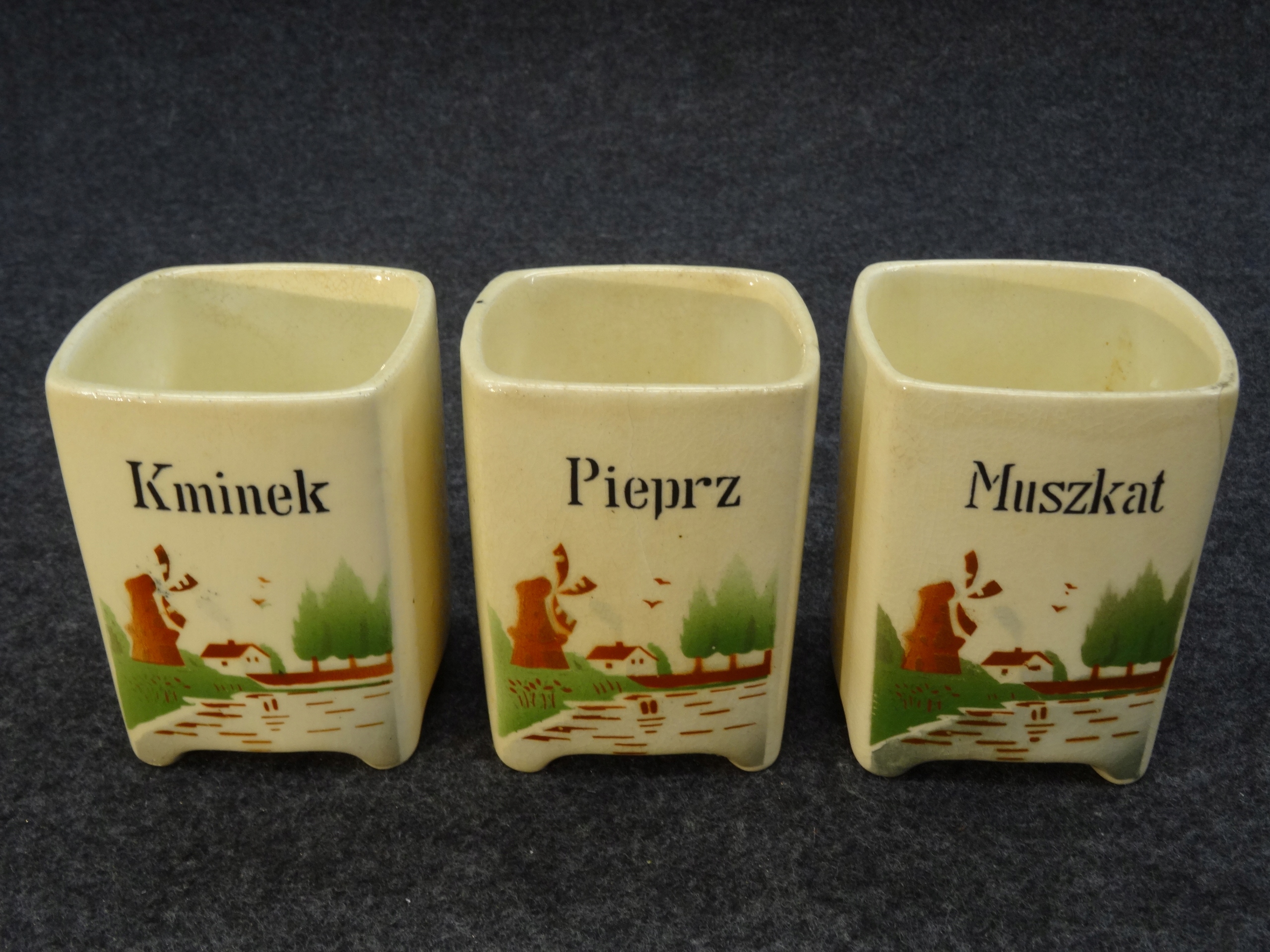 3 штуки довоенных контейнеров для специй с описанием ПЕРЕЦ ТМИН МУСКАТ Фаянсовая фабрика Станислава Маньчука Ходзеж, 1920-30-е гг.