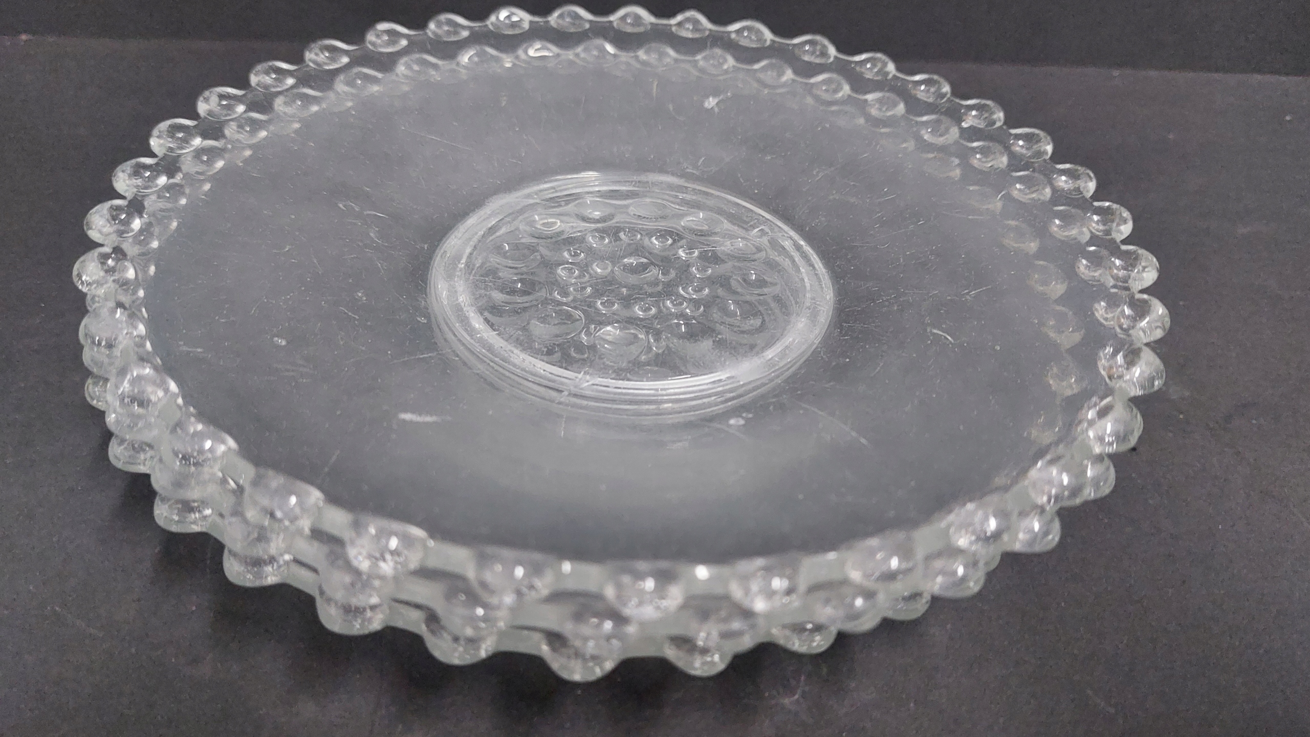 Набор старых десертных тарелок со стеклянными жемчужинами вокруг них. Стекло матовое,