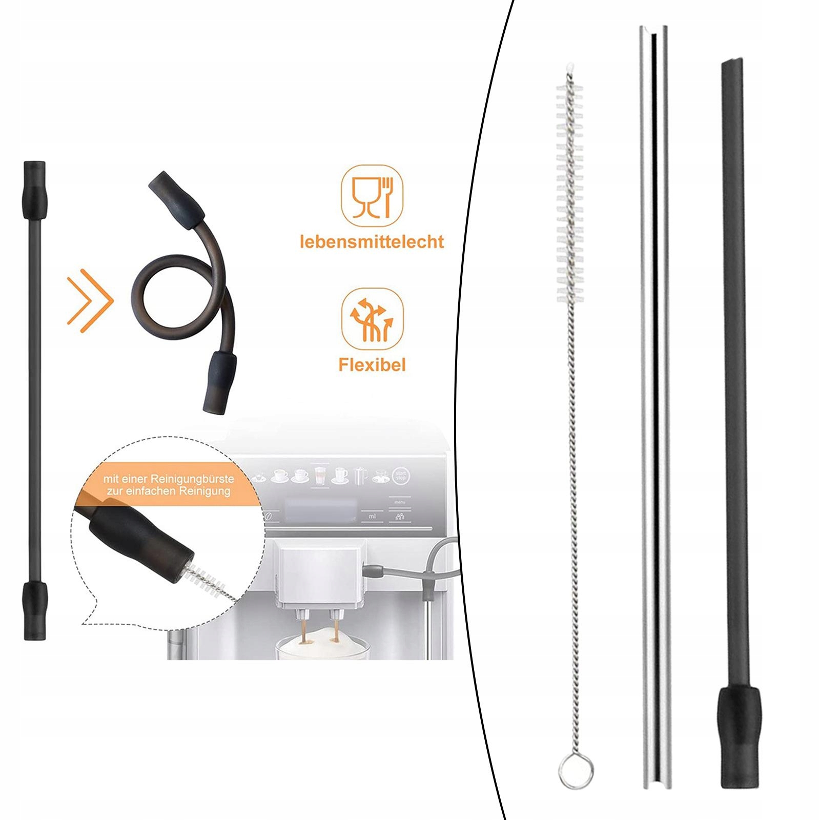 Продукция: В комплекты для замены полностью автоматической кофемашины входят молочный шланг из нержавеющей стали, силиконовый молочный шланг и щетка для чистки.