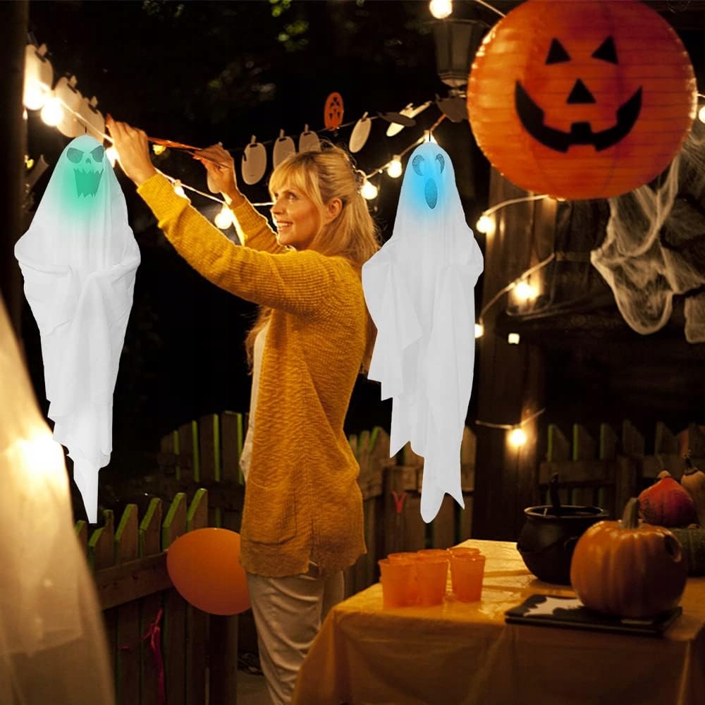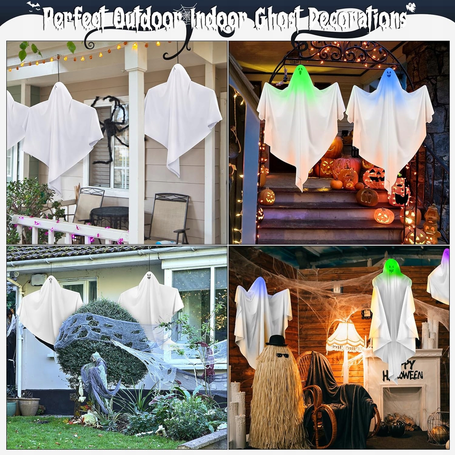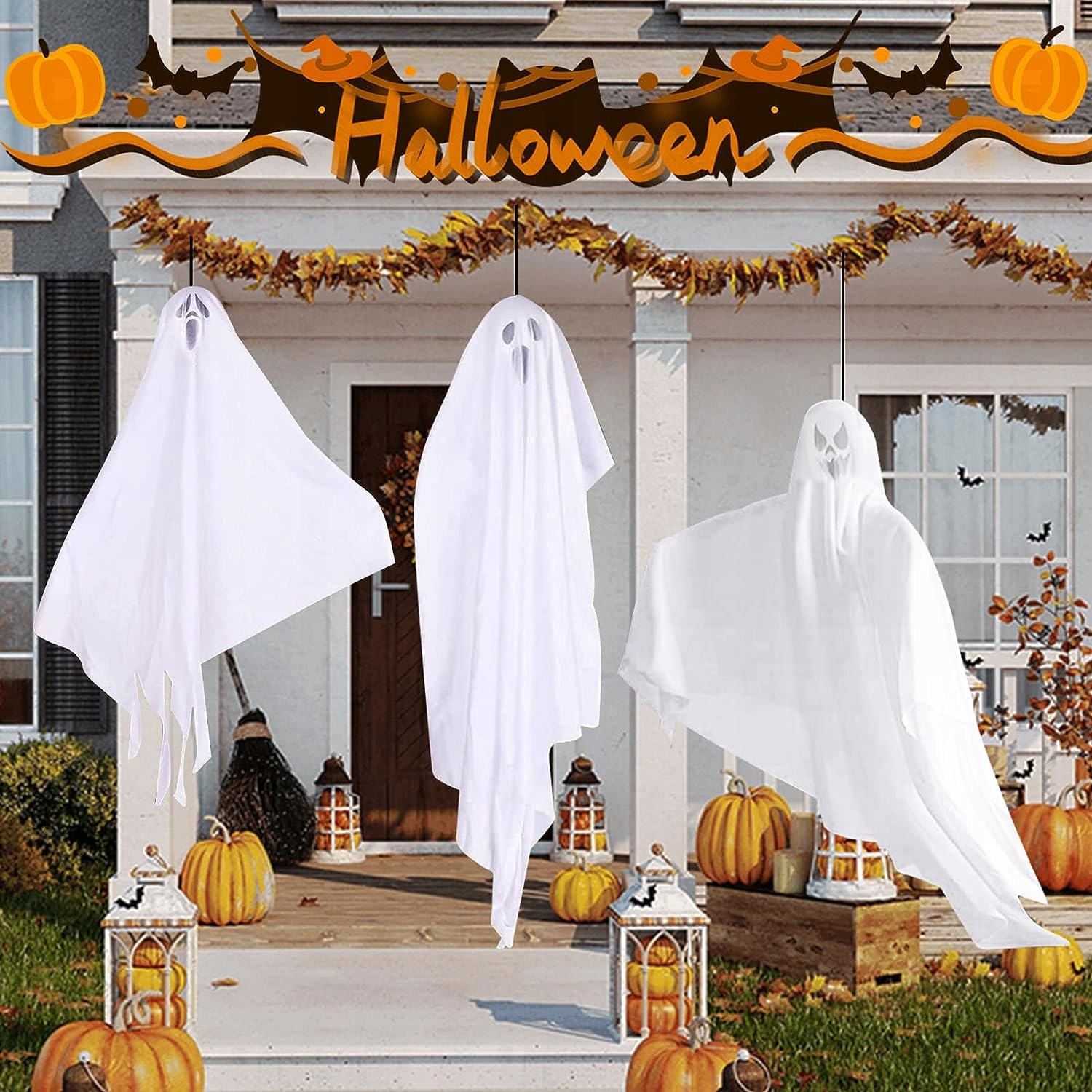 Размер висящих призраков на Хэллоуин составляет около 57 х 83 см, чего достаточно, чтобы видеть дальше. У каждого висящего призрака есть веревка, которую можно легко повесить куда угодно без шестов и дополнительных опор. Идеальный размер для украшения окон, дверей и деревьев. Лучшие украшения для помещений и улицы для вечеринок на тему Хэллоуина.