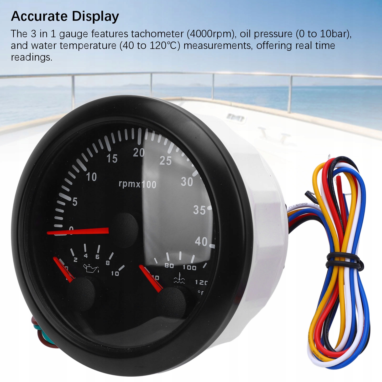 1. Точный дисплей: объемометр 3 в 1 (4000 об/мин), давление масла (от 0 до 10 бар) и температура воды (от 40 до 120), отображающие показания в реальном времени.