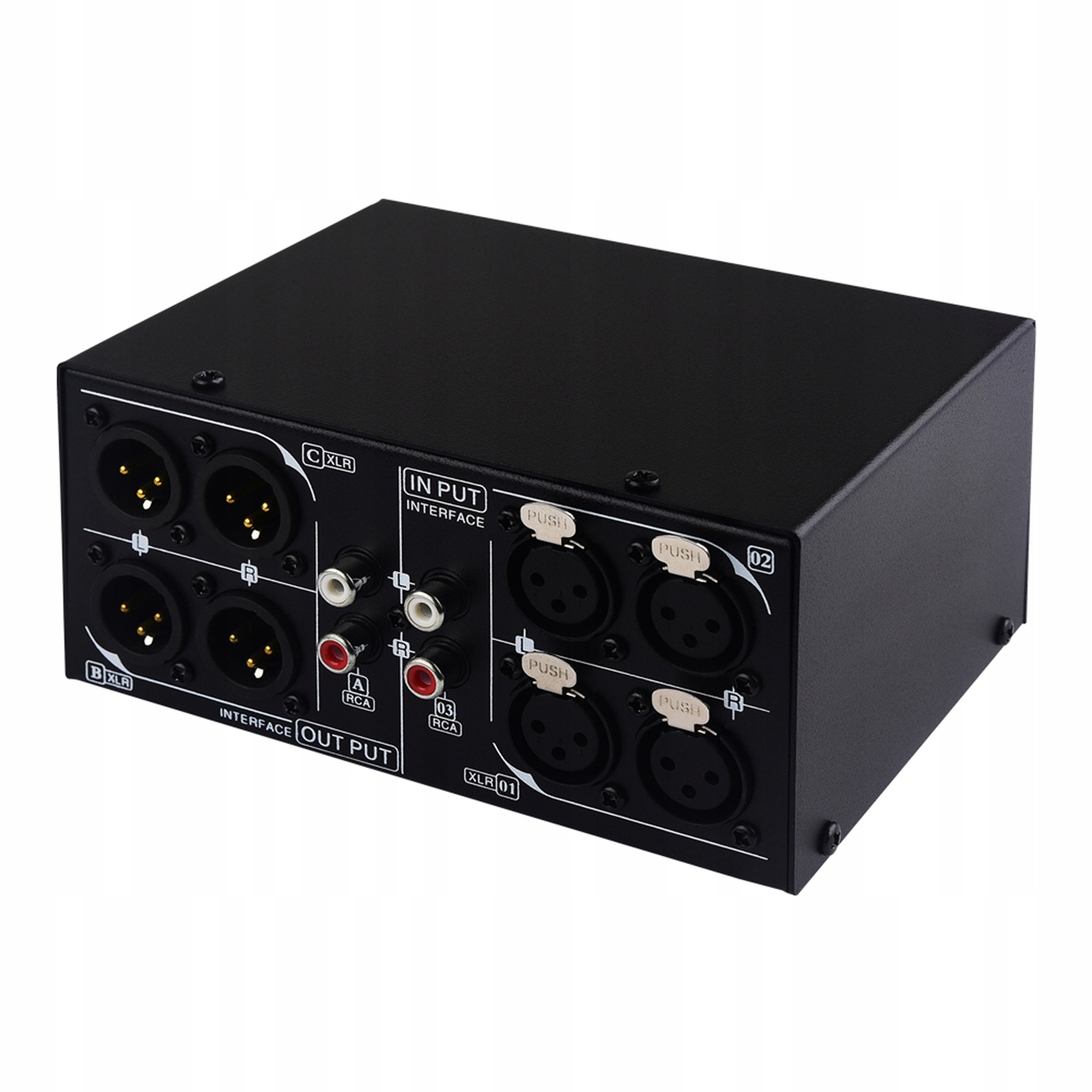 Функция: 1. Две входные группы сигнала XLR, две выходные группы сигнала XLR, подключение RCA и выходная группа.