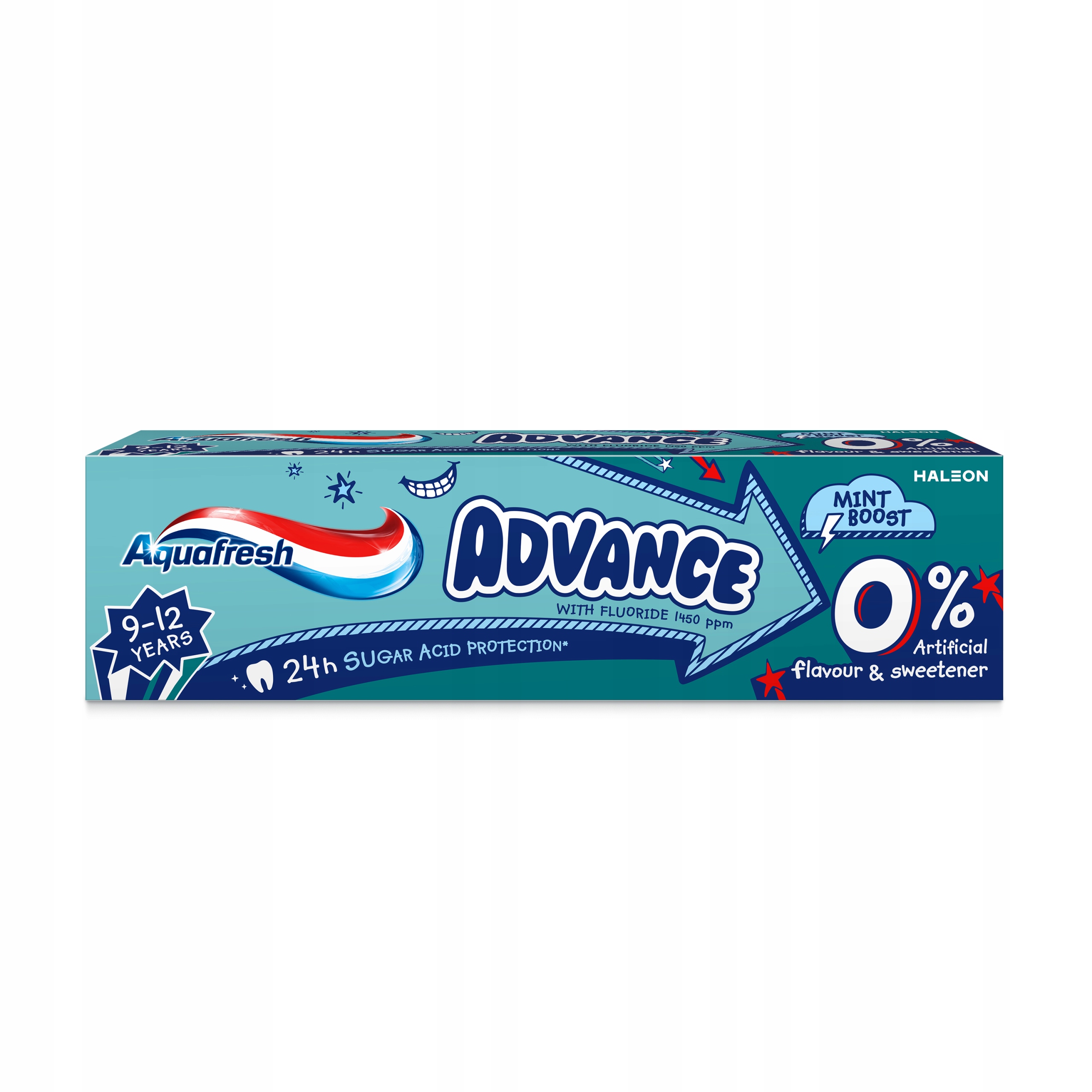 Зубная паста «Аквафреш Адванс» создана специально для детей 9–12 лет. Именно в этот период появляется большинство постоянных зубов, которые нуждаются в особой защите. Новые зубы на 50 % более чувствительны, и для их полной прочности требуется до 3 лет.