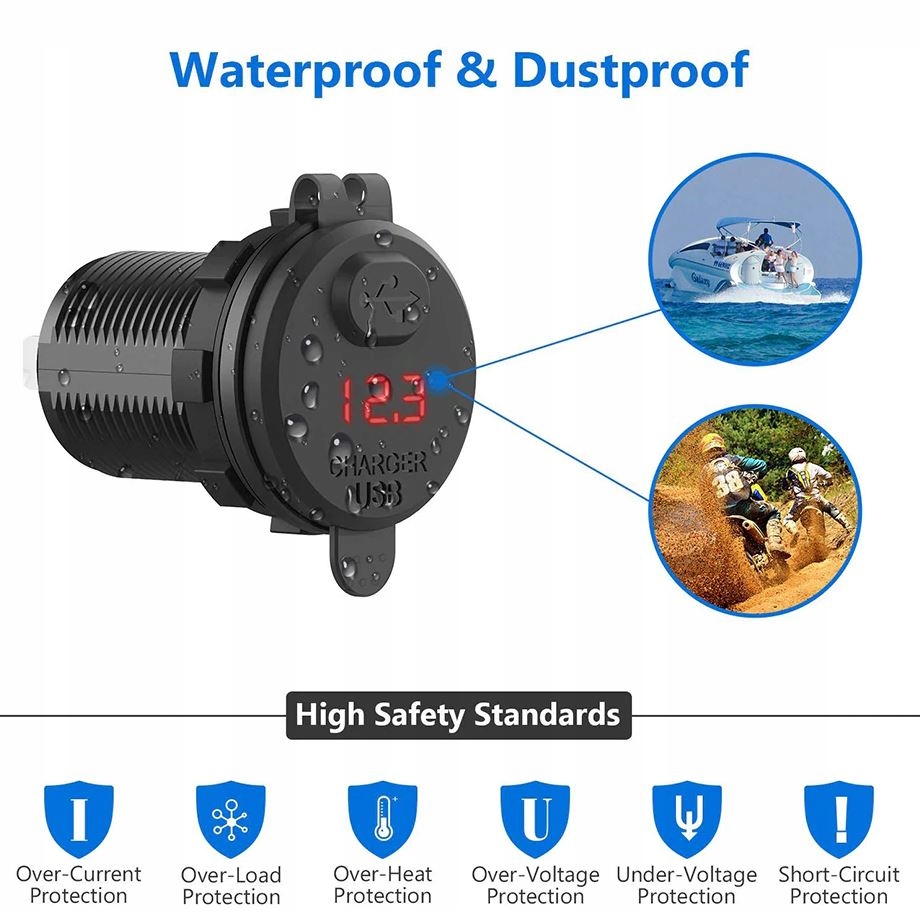 ВОДОНЕПРОНИЦАЕМОЕ ЗАРЯДНОЕ УСТРОЙСТВО USB 5В 3.0А С ВОЛЬТМЕТРОМ И ЗЕЛЕНЫМ ВЫКЛЮЧАТЕЛЕМ