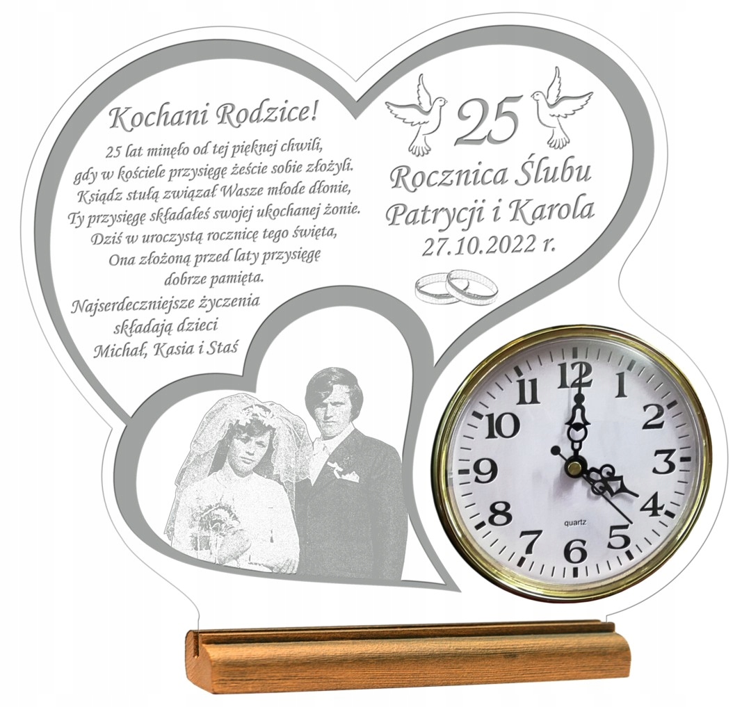 <р>2. какой юбилей, имена юбиляров, дата свадьбы или церемонии, посвящение (например, «Дорогие родители», «Дорогие юбиляры» и т. д.) <р>3. кто желает <р>4. № образца. <р>5. Пожалуйста, отправьте фотографию (без обработки) на адрес электронной почтыПо запросу мы отправляем дизайн статуэтки на согласование перед выполнением.