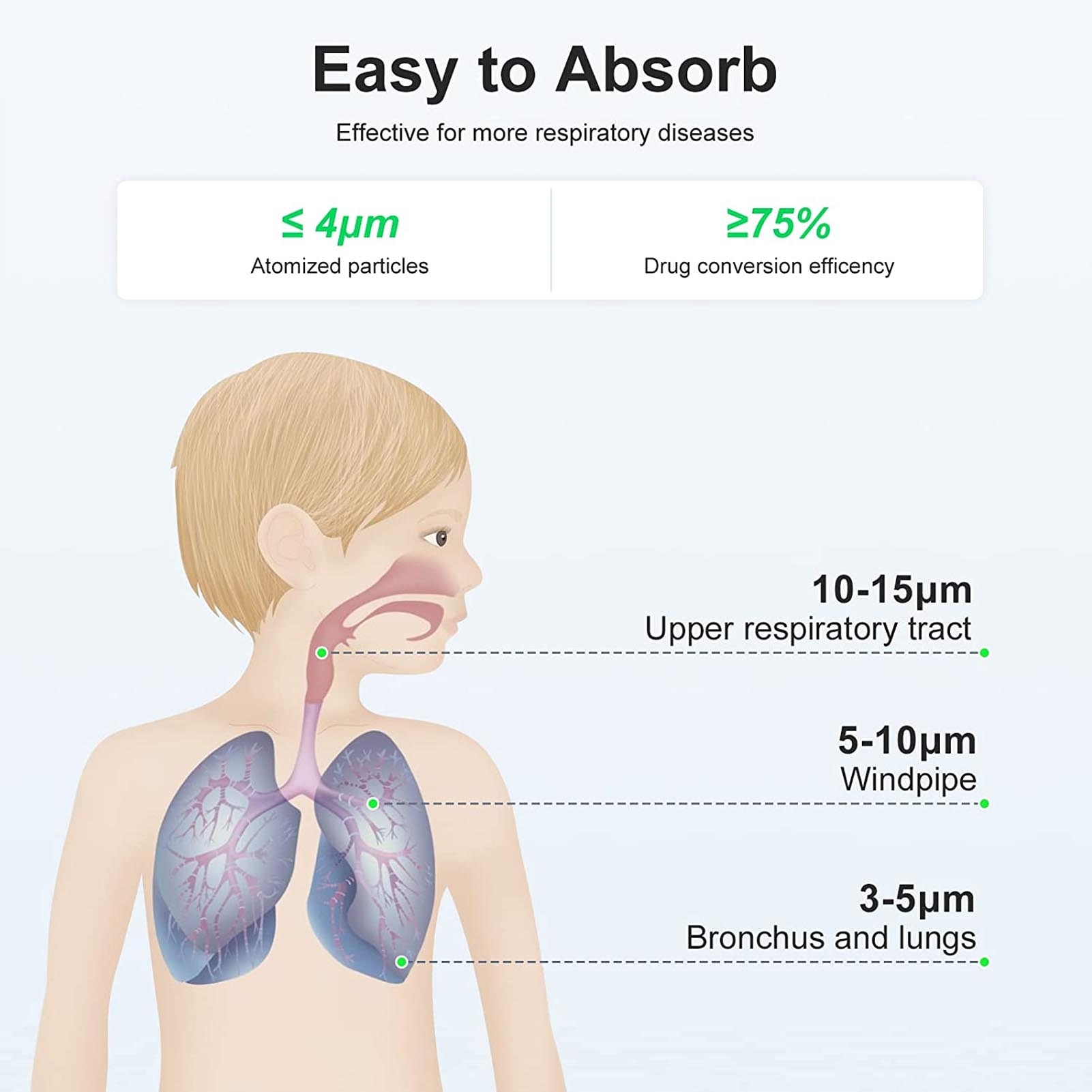 1. [Генерация мелкого тумана] В этом распылителе используется передовая технология с 3500 микроотверстиями, которая способна непрерывно и стабильно генерировать мелкий туман, обеспечивая глубокое поглощение. 2. [Быстро и эффективно] Распыление 5 мл жидкости занимает всего 5–10 минут, обеспечивая быстрое облегчение и удобное использование, управление одной кнопкой, простоту в использовании. 3. [Автовыключение и очистка] Мини-распылитель может автоматически отключаться при отсутствии жидкости, обеспечивает безопасность, а также имеет функцию автоматической очистки для простоты обслуживания. 4. [Компактный и портативный] Благодаря небольшому размеру этот классный ингалятор тумана можно легко носить с собой в кармане или сумке, поэтому вы можете использовать его в дороге, что делает его идеальным для путешествий. 5. [Универсальные варианты питания] Этот дыхательный распылитель может питаться от 2 батареек типа АА (не входят в комплект) или от USB-кабеля, что обеспечивает гибкость в выборе источников питания.