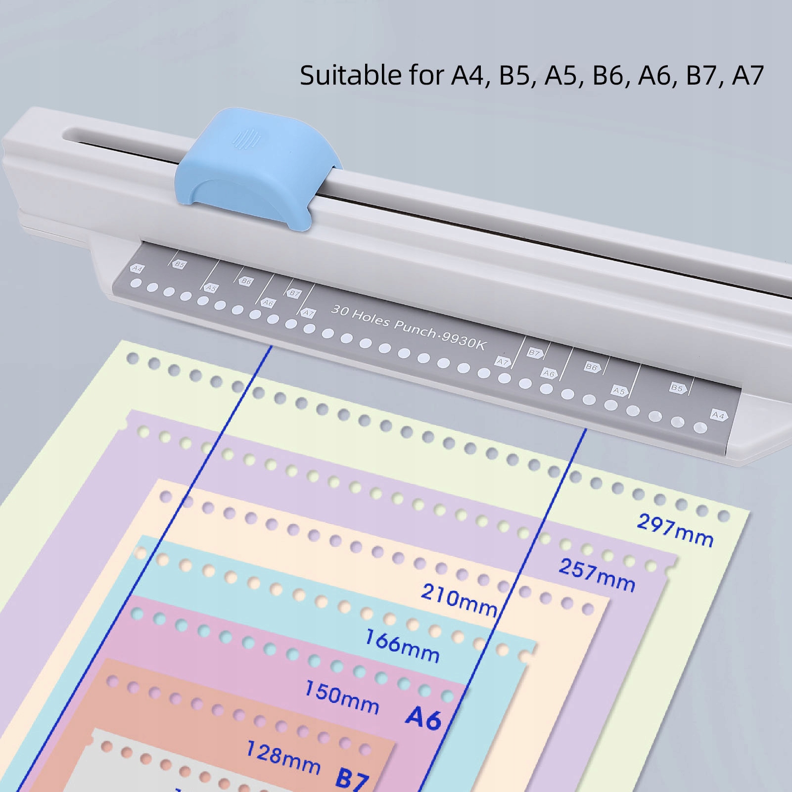 Особенность:1. [Универсальный дырокол] Дырокол можно использовать для пробивания отдельных листов бумаги, журналов и т. д., совместимых с различными форматами, включая A4, B5, A5, B6, A6, B7, A7.