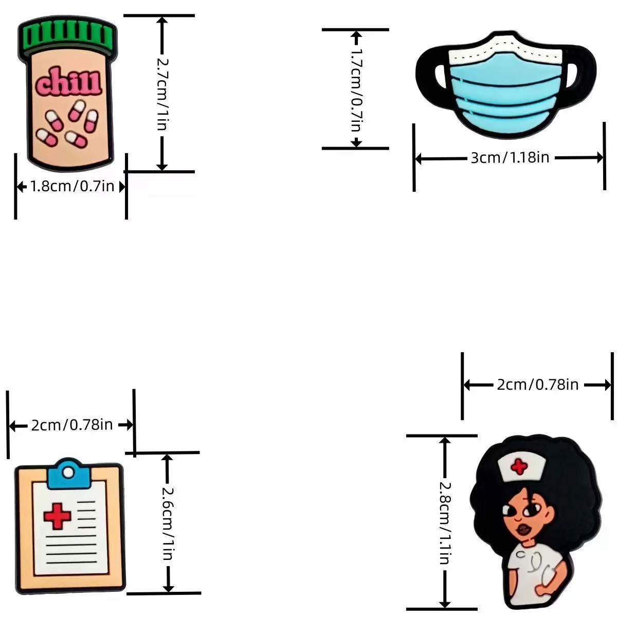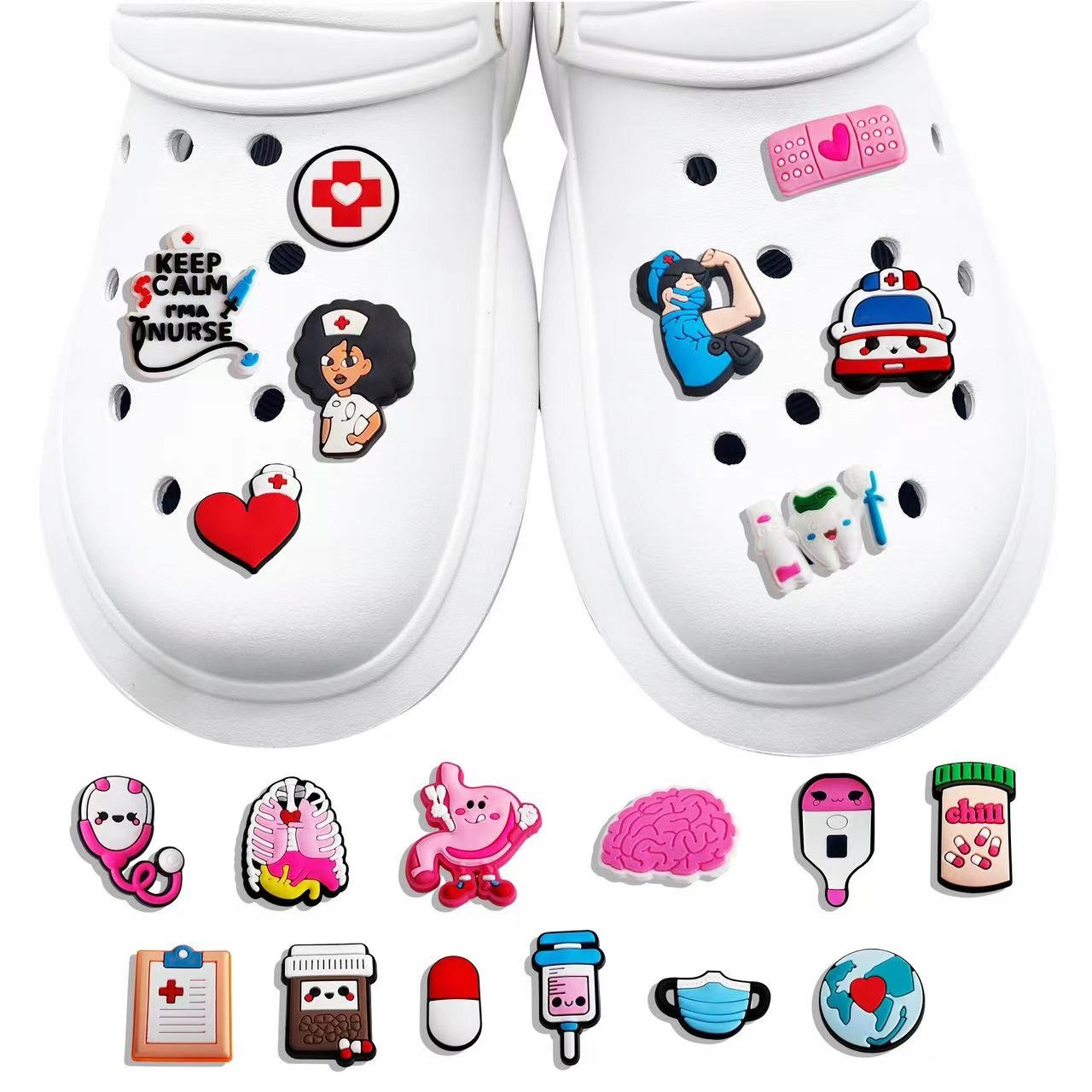 Установите 30 обувь для обуви в медицинском стиле. В нем вы найдете забавные дизайны, такие как шприцы, таблетки, стетоскопы, сердца и многое другое. Идеально подходит для персонализации обуви и давая им уникальный персонаж.