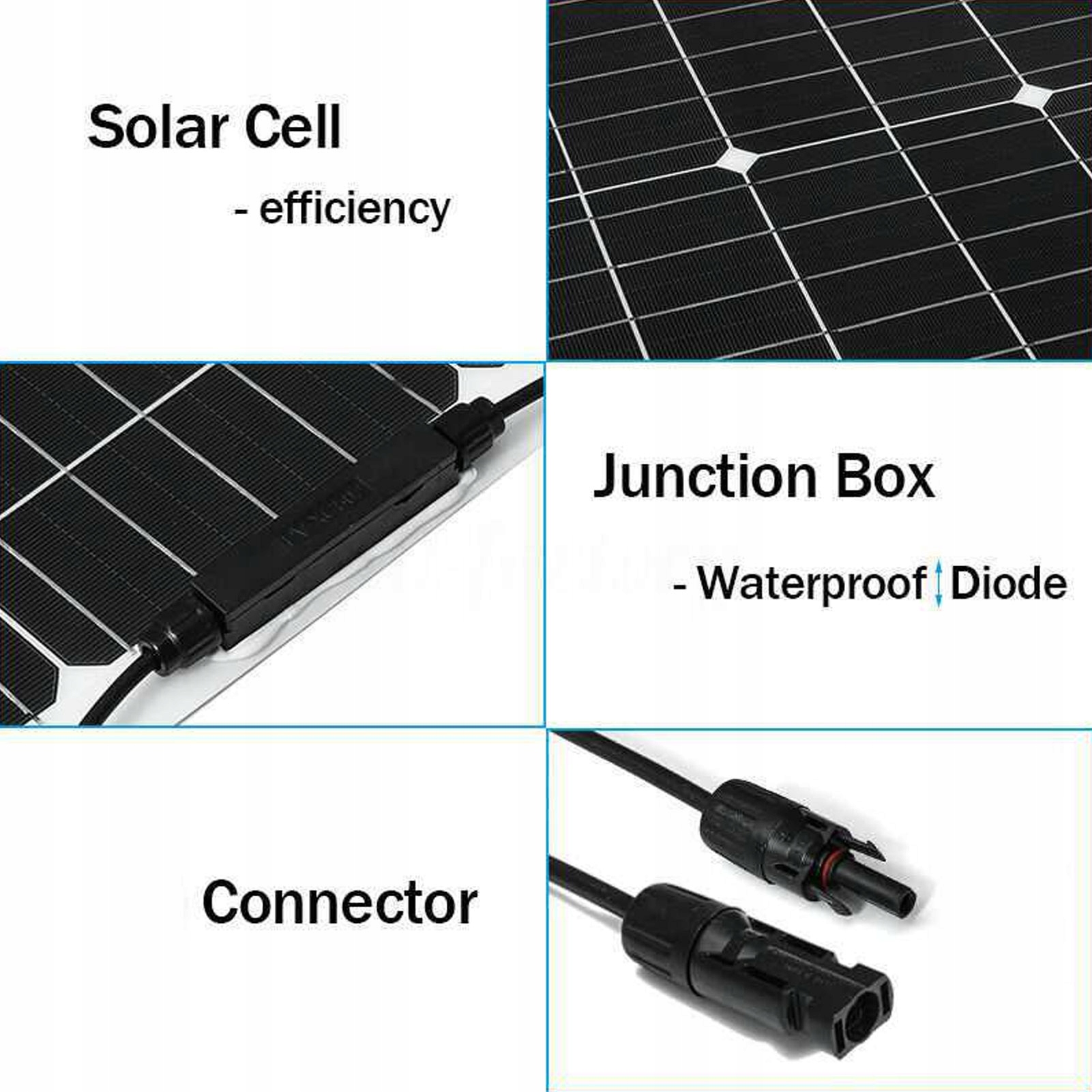 1. Высокая проницаемость: закаленное стекло с высокой низкой проницаемостью железа для повышения жесткости и воздействия; Кабели разъема солнечной панели для легкой подключения и воспроизведения.