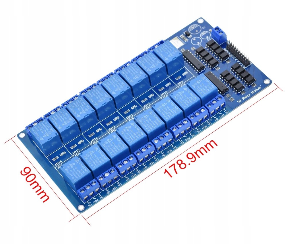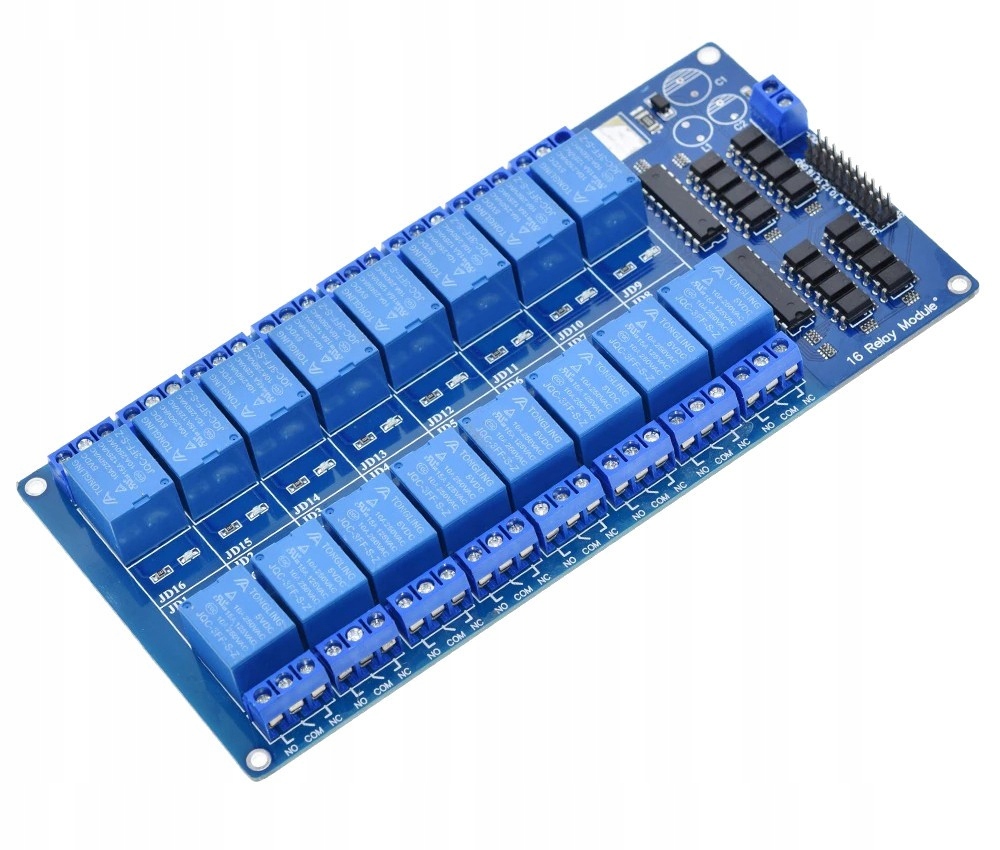 ✔️ Модуль позволяет управлять исполнительными устройствами, потребляющими ток до 10 А, используя порты микроконтроллера или любого контроллера. Модуль оснащен 16 реле с питанием катушек 5В.