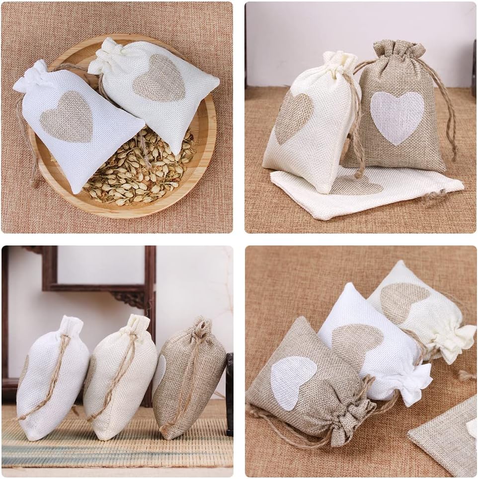 ✅【Уникальные детали】: Подарочный пакет украшен красивым узором в виде сердечек цвета хаки, теплым и красивым элементом, который выглядит более изысканным и элегантным, милым и особенным. Джутовая сумка также снабжена шнурком в винтажном стиле, который легко открывать и закрывать и предотвращает падение и потерю предметов.