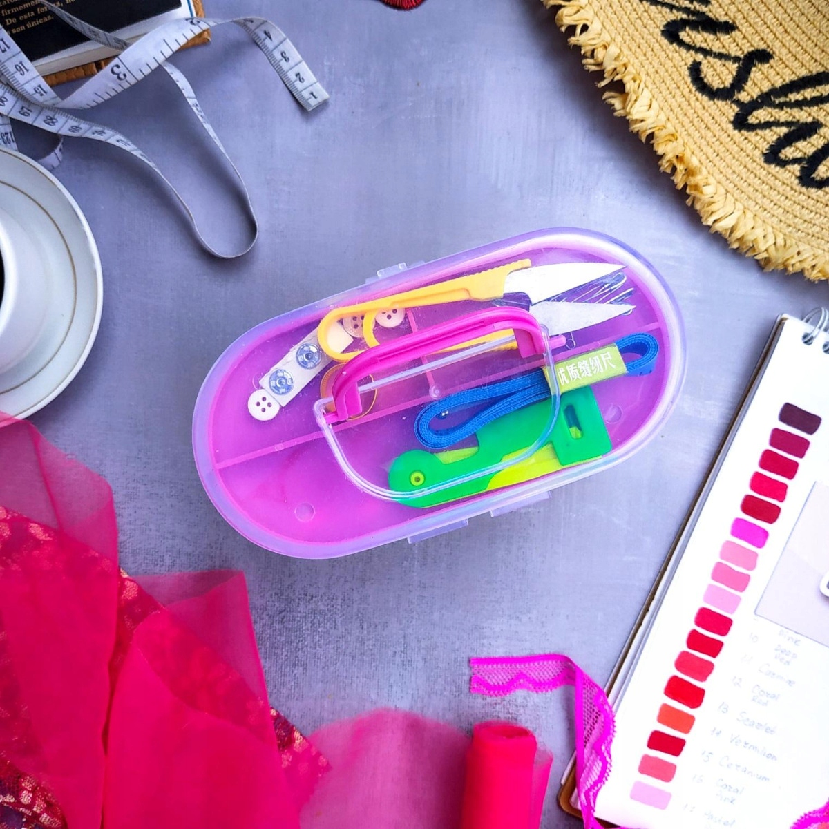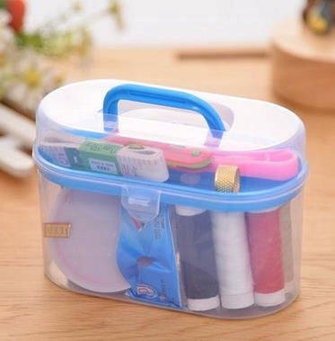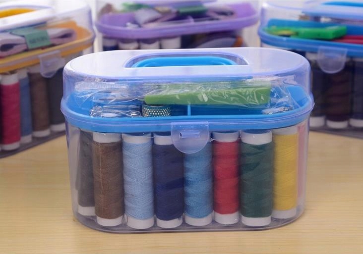 Набор для шитья содержит все необходимое для шитья. В коробке использовано отличное решение: она разделена на две части. В верхней части находятся аксессуары: рулетка, ножницы, булавки и т. д., а в нижней части — нитки разных цветов.