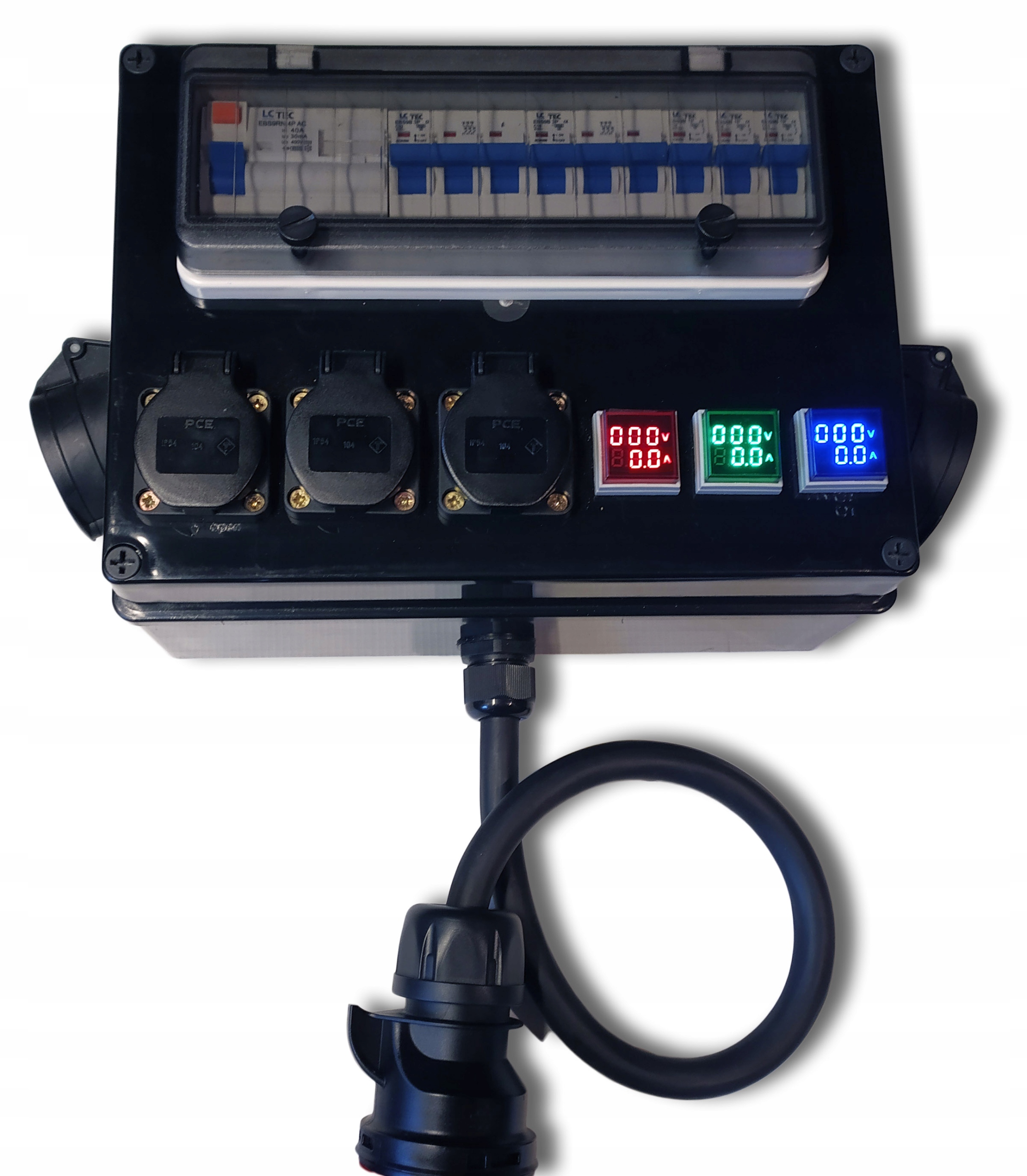 Щит распределительный ступенчатый 32А, черный, 32А/5 16А/5 3х230В с защитами