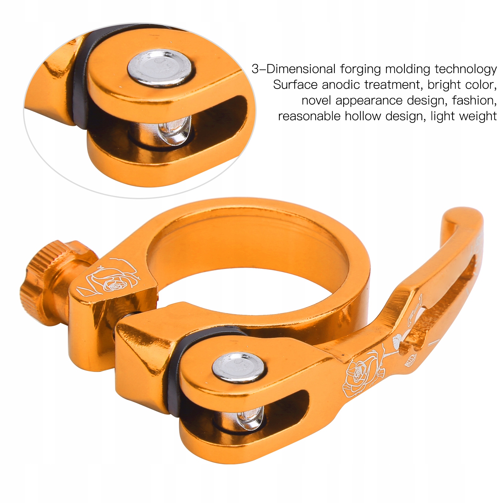 1. Высококачественный материал из алюминиевого сплава, коррозионная стойкость, легкий вес и высокая твердость. 2. Быстроразъемный зажим подседельного штыря обладает хорошей стабильностью, его легко устанавливать и снимать. 3. Зажимы удобно регулировать по ходу, чтобы поездка была плавной. 4, анодированная поверхность, разумная полая конструкция, новая и модная. 5, подходит для большинства велосипедных зажимов и является незаменимым аксессуаром для езды.