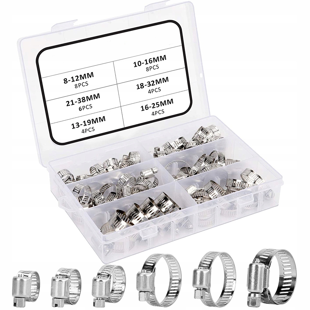 Набор металлических хомутов можно использовать в водяных, воздушных, газовых и автомобильных установках. Их простая конструкция делает соединение чрезвычайно прочным и безопасным после установки ленты. Закругленные края не повреждают зажимаемый предмет. Их установка чрезвычайно быстра и проста – достаточно надеть их на шланг, а затем затянуть отверткой. В комплект входят 34 повязки на голову и удобный органайзер.