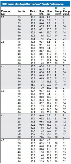 rain Carlen ™ нет. The nozzle tree containing nozzles with a reduced trajectory (10 ° angle) and 8 standard nozzles Rain Curtain ™ NOZZles (25 ° trajectory angle) ensures the possibility of a sprinkler range in the range from 7.6 to 15.2 m