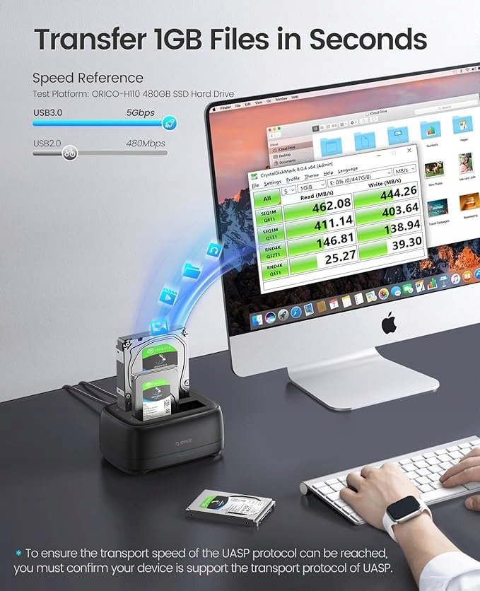 [USASP Service] Дисковая станция жесткого диска поддерживает протокол передачи UASP и достигает скорости передачи до 5 Гбит / с благодаря портам USB 3.0. Док-станция жесткого диска поставляется с кабелем USB 3.0 (A-B) длиной 1 м и использует 12-й источник питания для быстрой и стабильной работы