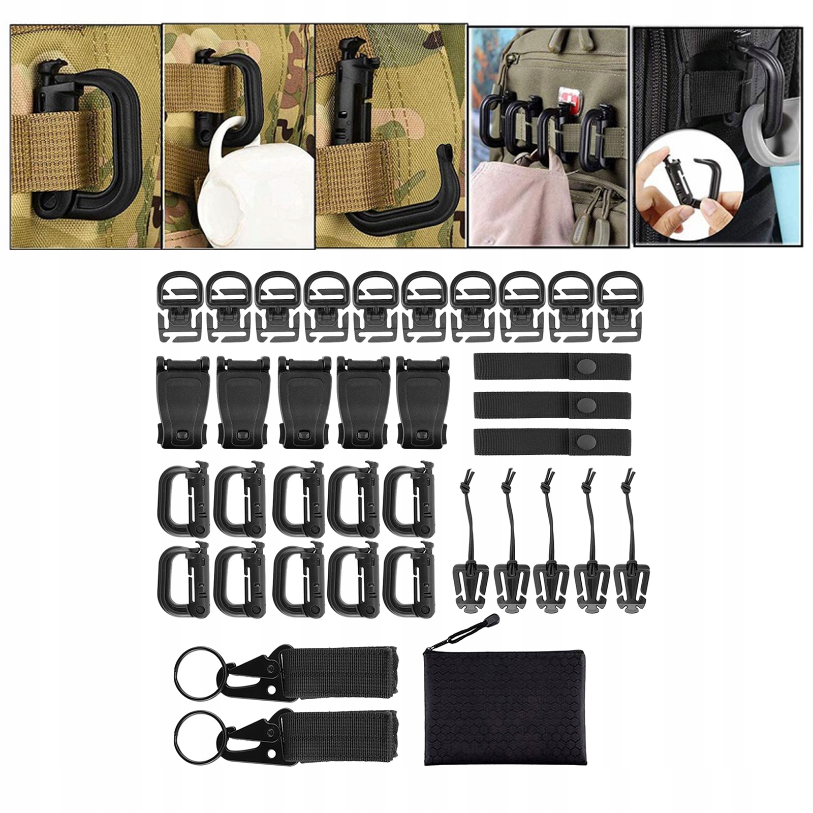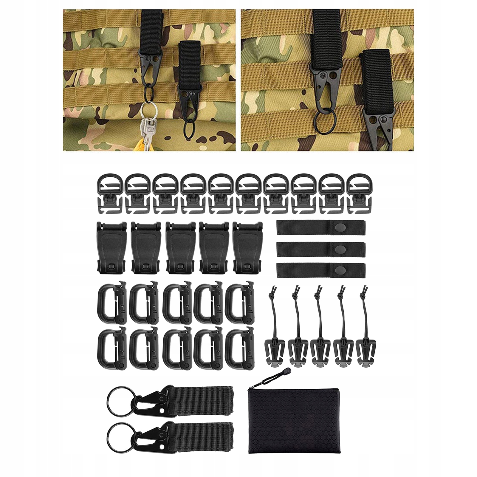 В комплект входят 10 зажимов с D-образными кольцами, 10 вращающихся на 360 градусов зажимов с D-образными кольцами, 5 эластичных шнуров Web Dominator, 3 ремня MOD, 2 брелока для ключей Molle, 5 пряжек Web Dominator, 1 бесплатный чехол для хранения на молнии.