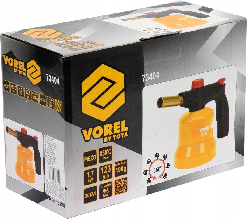 Газовая лампа Lutownia с зажиганием пьезовой марки Vorel 73404 на 360 °. Aprzylana является газом пропана-бутана в 190 г картриджах (EN417-тип 200- широко доступный на рынке). Горелка имеет мощность 1,7 кВт и температуру до 850 ° С. Среднее потребление газа составляет 123 г/ч. Тем не менее, мощность пламени может быть плавно отрегулирована с помощью встроенной ручки. Горелка имеет пьезо зажигание, благодаря которой ее работа очень удобна и проста. Металлический корпус резервуара устойчив к повреждению, благодаря которой прочность горелки значительно увеличивается. Особым преимуществом горелки Vorel 73404 является способность работать под углом 360 °. Благодаря этому он может быть использован в любой позиции. Бой особенно полезен для: мягкой пайки, покалывающего умирающего и гриля печей и жарких сорняков в гастрономической пайки, предназначенной для: - мягкий паяль - гальванизация - нагревание - ослабление винтов - загара или изгиба труб, пластины - освещение гриля - в гастрономии.
