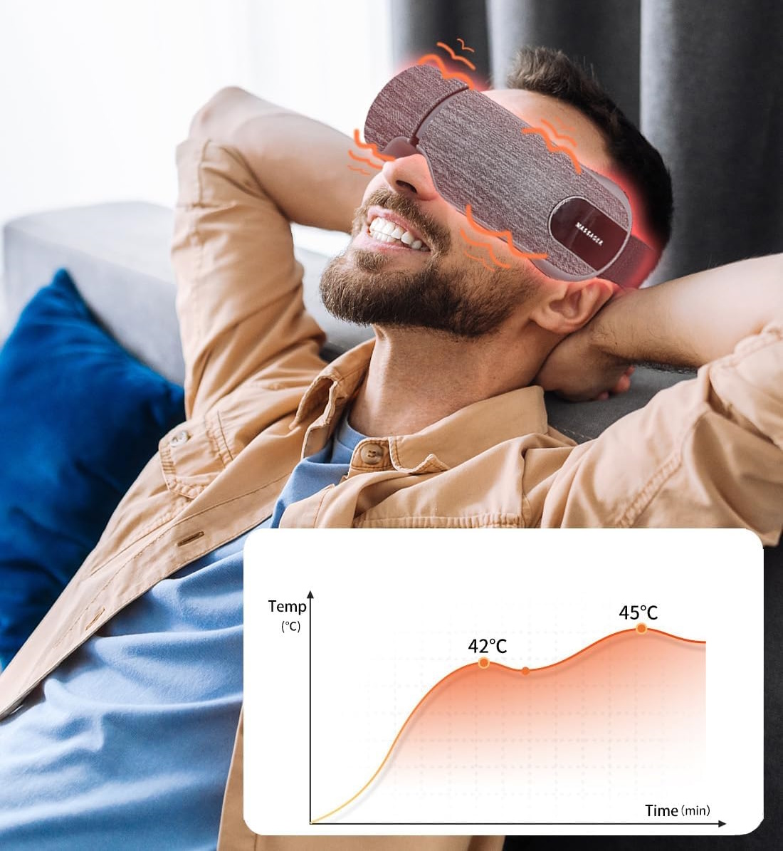 - Все больше людей испытывают проблемы с сухостью глаз и страдают синдромом сухого глаза. Чрезмерная усталость может вызвать отек и покраснение. Прибор неинвазивно расслабляет область висков и глаз, улучшая кровообращение и даря ощущение расслабления после тяжелого рабочего дня.