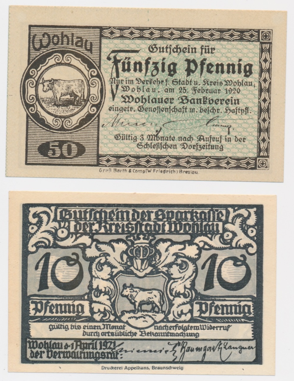 3642. Wohlau (Wołów) 50 Pf 1920 и 10 Pf 1921 - ул. 1