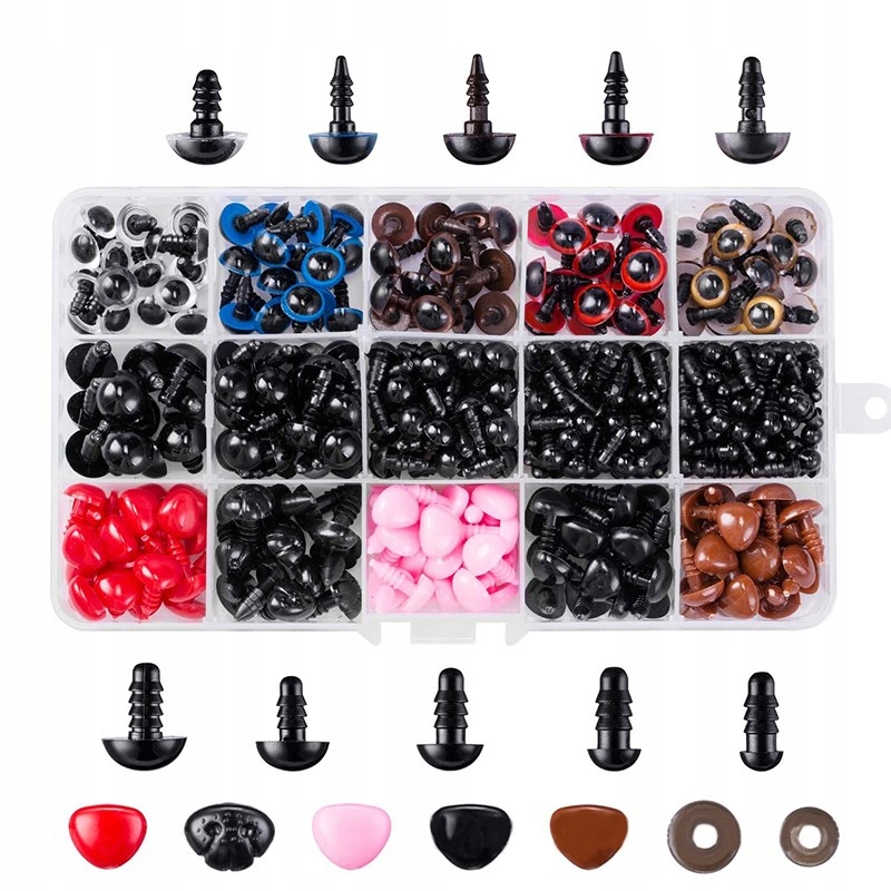 Набор глазков и зажимов для носа для талисманов в удобной коробке. В наборе примерно 282 глаза (т.е. 141 пара) и 93 носа. К каждому носику и петельке прикрепляется зажим; все зажимы упакованы в отдельный полиэтиленовый пакет, прилагаемый к коробке.