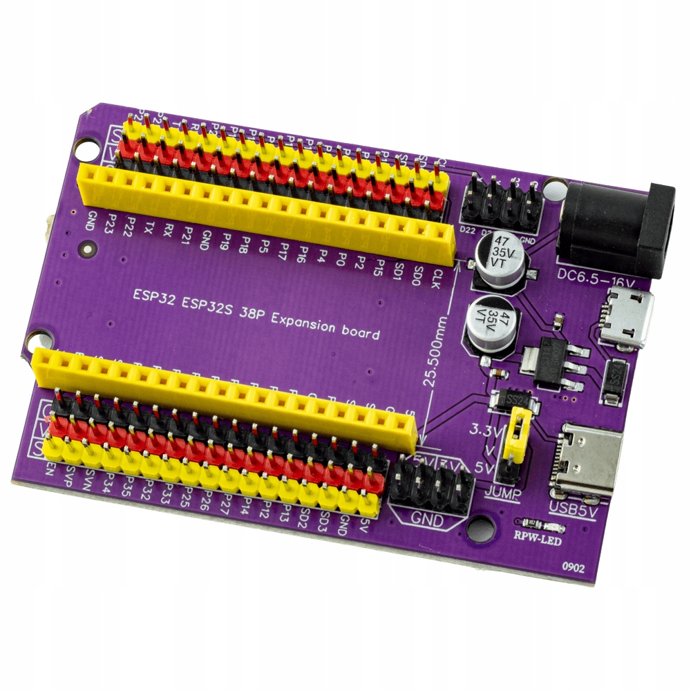 Мы представляем адаптер 38 -pin для плиток ESP32 - универсальный модуль, расширяющий популярные модули ESP32. Это позволяет вам удобно использовать плитку в ваших прототипах без необходимости подключения руководства по поставке. USB -порты используются только для питания, невозможно программировать с их использованием