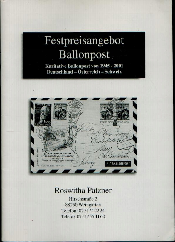 38038 Ballonpost Festpreisangebot. Каталог продаж товаров, связанных с воздушной почтой с 1945 по 2001 год. В каталог входят: Германия, Австрия и Швейцария. 48 страниц. Формат: 21 х 14,5 см. В каталоге только описания, фотографий нет. Цены, указанные в каталоге в евро, являются ценами продажи, а не стартовыми ценами.