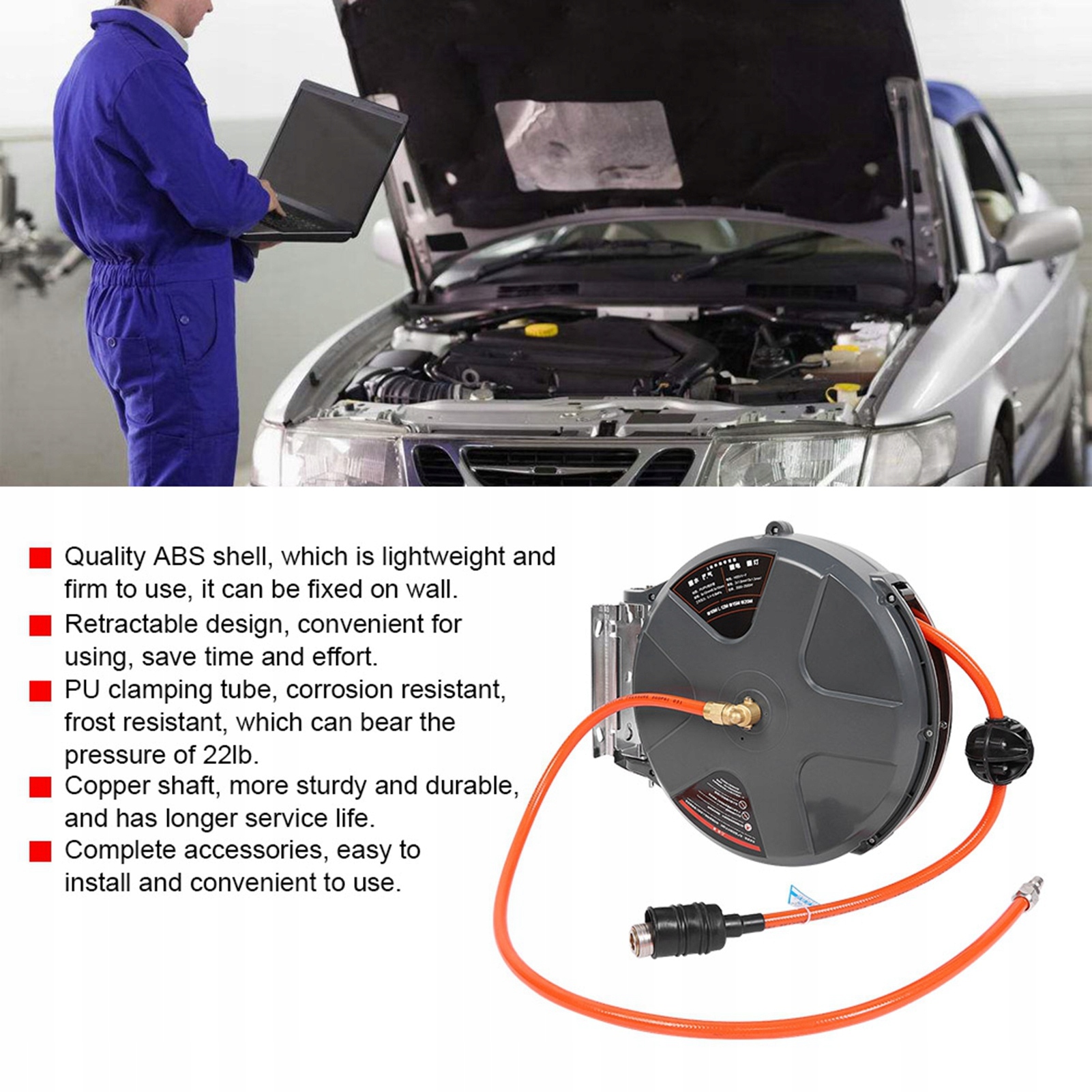 1. Высококачественный корпус из АБС-пластика, легкий и прочный в использовании, можно прикрепить к стене 2. Выдвижная конструкция, удобна в использовании, экономит время и усилия 3. Зажимная трубка из полиуретана, устойчивая к коррозии, морозостойкая, выдерживает 22 фунта давление 4. Медный вал, более прочный и долговечный, имеет более длительный срок службы. 5. Полный комплект аксессуаров, простой в установке и удобный в использовании.