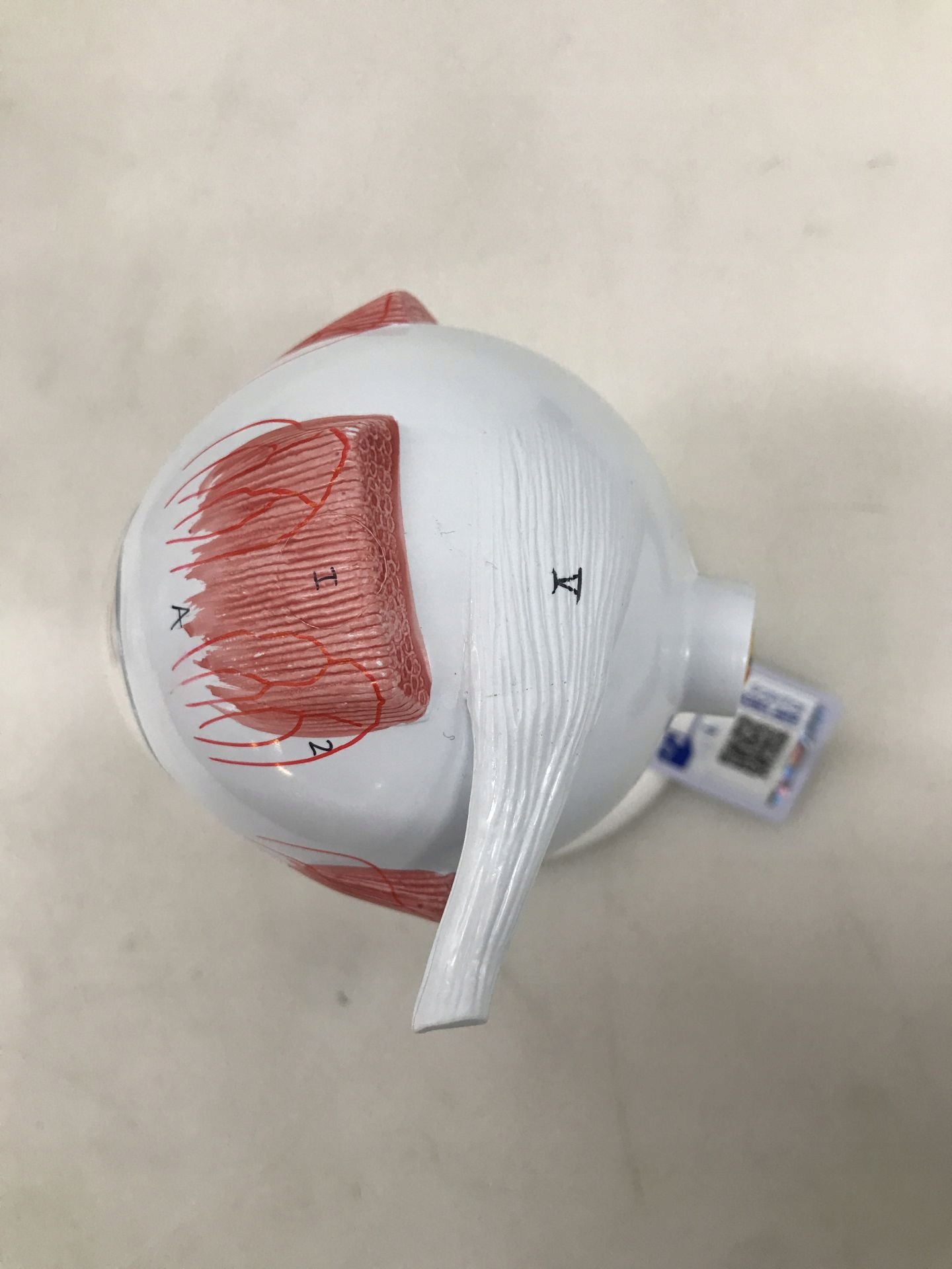 6-частная анатомическая модель человеческого глаза разделена на: обе половины склеры с прикреплениями роговицы и глазных мышц, обе половины сосудистой оболочки с радужкой и сетчаткой, хрусталик глаза и стекловидное тело.