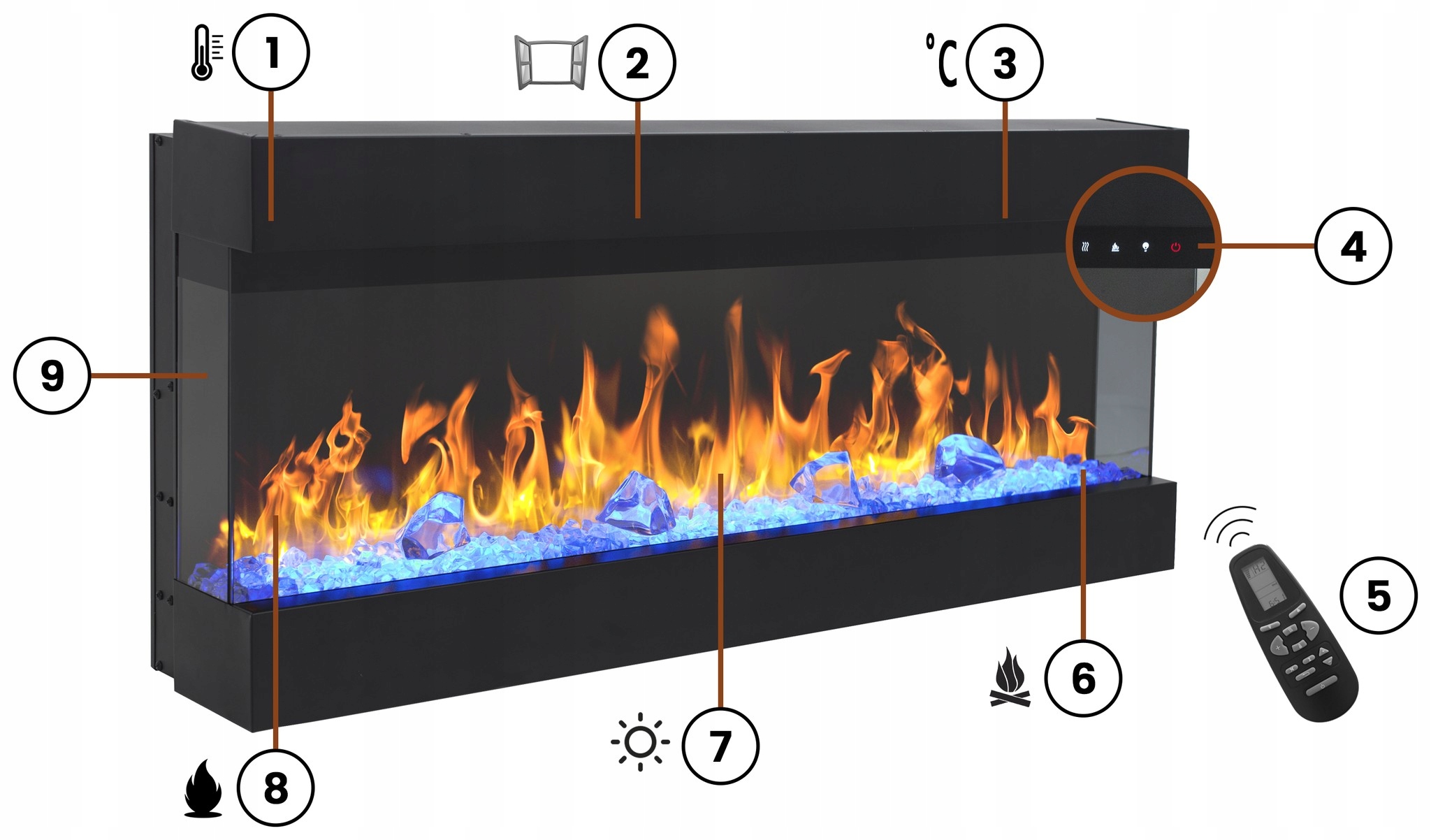 - Управление с помощью пульта дистанционного управления или сенсорной панели с подсветкой на камине: