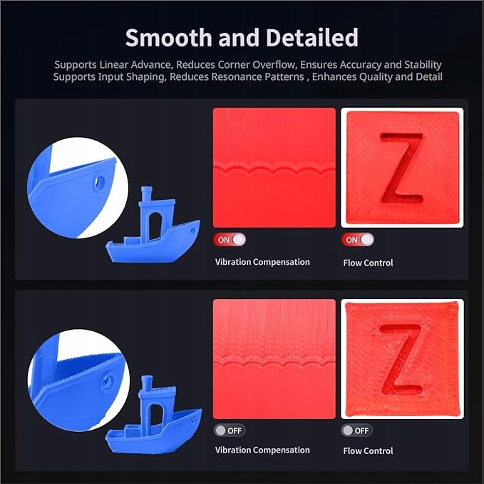 anycubic kobra 2 pro обеспечивает исключительное качество печати благодаря современной технологии компенсации вибрации. Встроенный -ин модуль акселерометра интеллектуально анализирует резонансные частоты и регулирует параметры печати, которые устраняют все артефакты и обеспечивают точные, стабильные отпечатки.