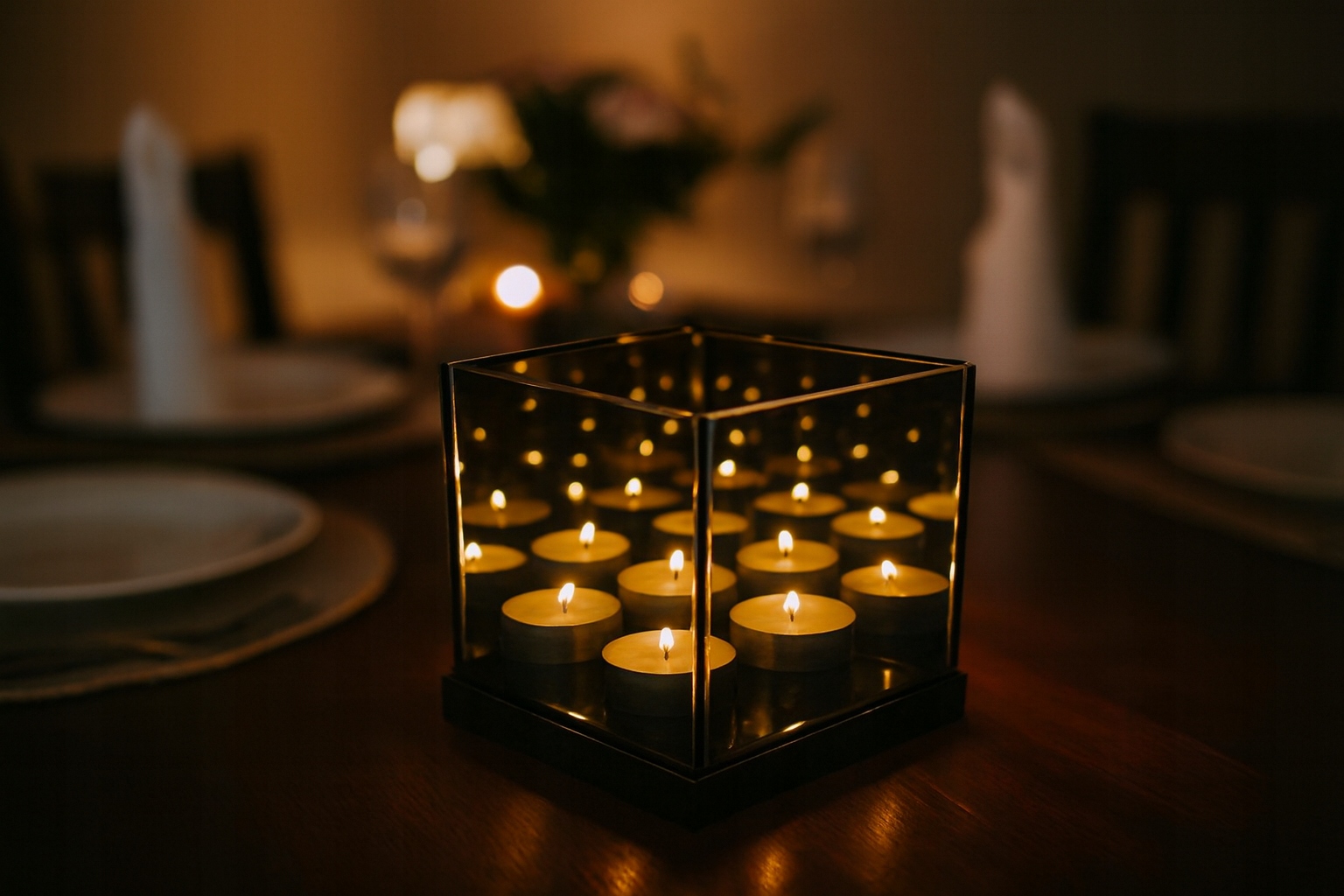 - 3D-эффект (бесконечное зеркало) — благодаря зеркальным стенкам свет свечей многократно отражается, создавая уникальное, завораживающее сияние.