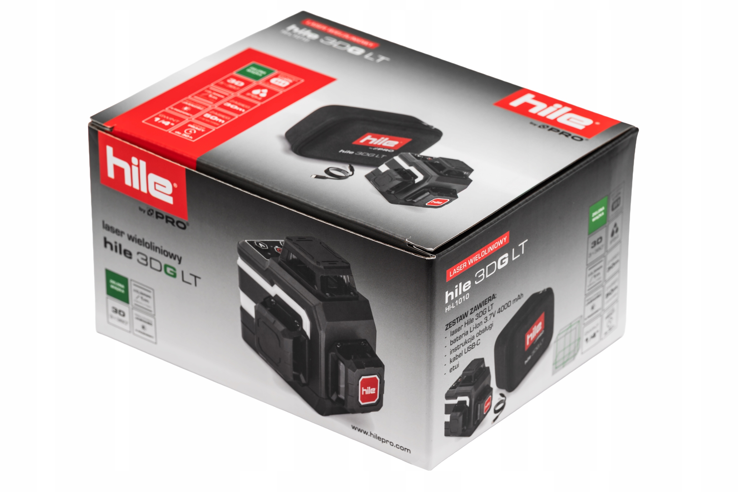 - В комплект входят: лазер HILE 3DG LT, литий-ионный аккумулятор 3,7 В. 4000 мАч, кабель USB-C, футляр, руководство пользователя.