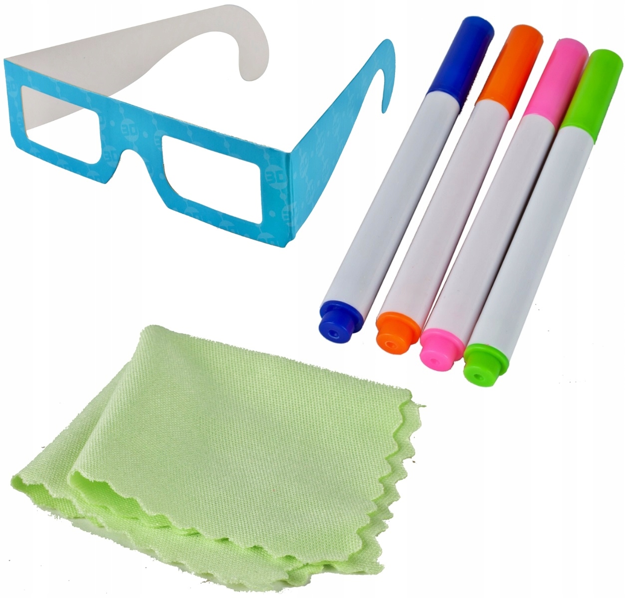 - В комплект входят: 3D-очки, 4 флуоресцентных маркера, эскизы для росписи и тряпочка.