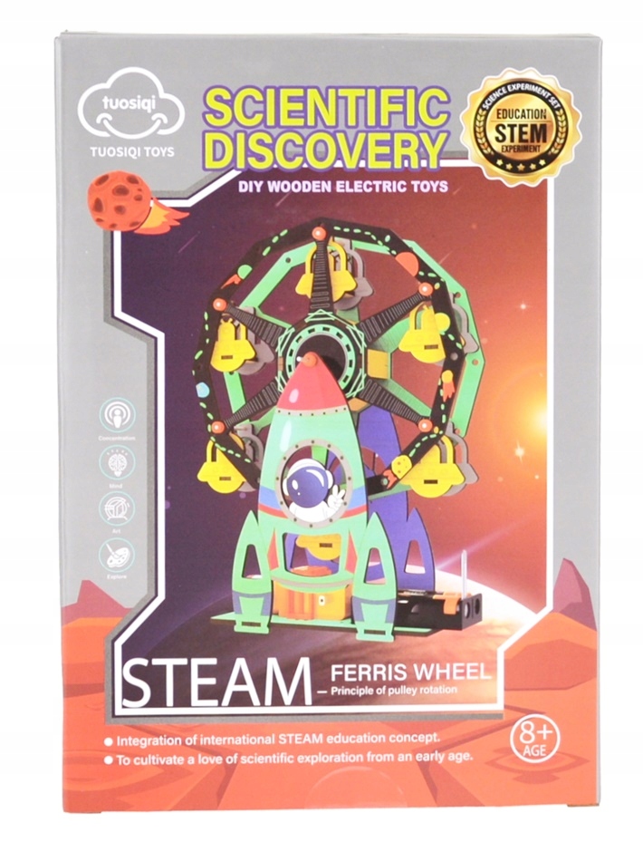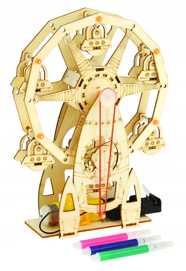 Игрушечную модель колеса обозрения необходимо собрать самостоятельно. Вы можете собрать ее вместе со своими детьми, чтобы помочь им понять принцип работы.